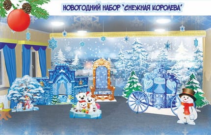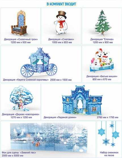 Размеры Декорация "Сказочный трон" (размер 1465 мм (высота) х 555 мм (ширина) х 540 мм (глубина)) Декорация "Снеговик" (размер 653 мм * 1000 мм) Декорация "Елочка" (размер 1200 мм * 900мм) Декорация "Карета Снежной королевы" (размер 2050мм * 1500 мм) Декорация "Белые мишки" (размеры 800мм * 670 мм) Декорация "Дерево новогоднее" (размеры 1270 мм * 1250 мм) Декорация "Ледяной домик" (размеры 2760 мм * 1795 мм) Фон для сцены «Зимний лес» (размеры 2000 мм * 5000 мм) Набор снежинок на леске – 25 шт
