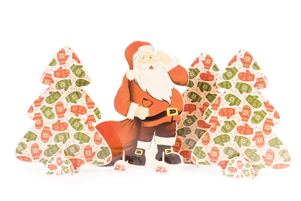 В комплекте Санта-Клаус (обратная сторона - лесной эльф), размер 91,5 см х 105 см, подставка под декорацию (2 шт) , декоративные элементы (2 шт)
