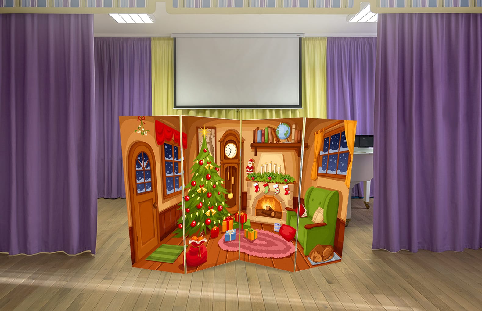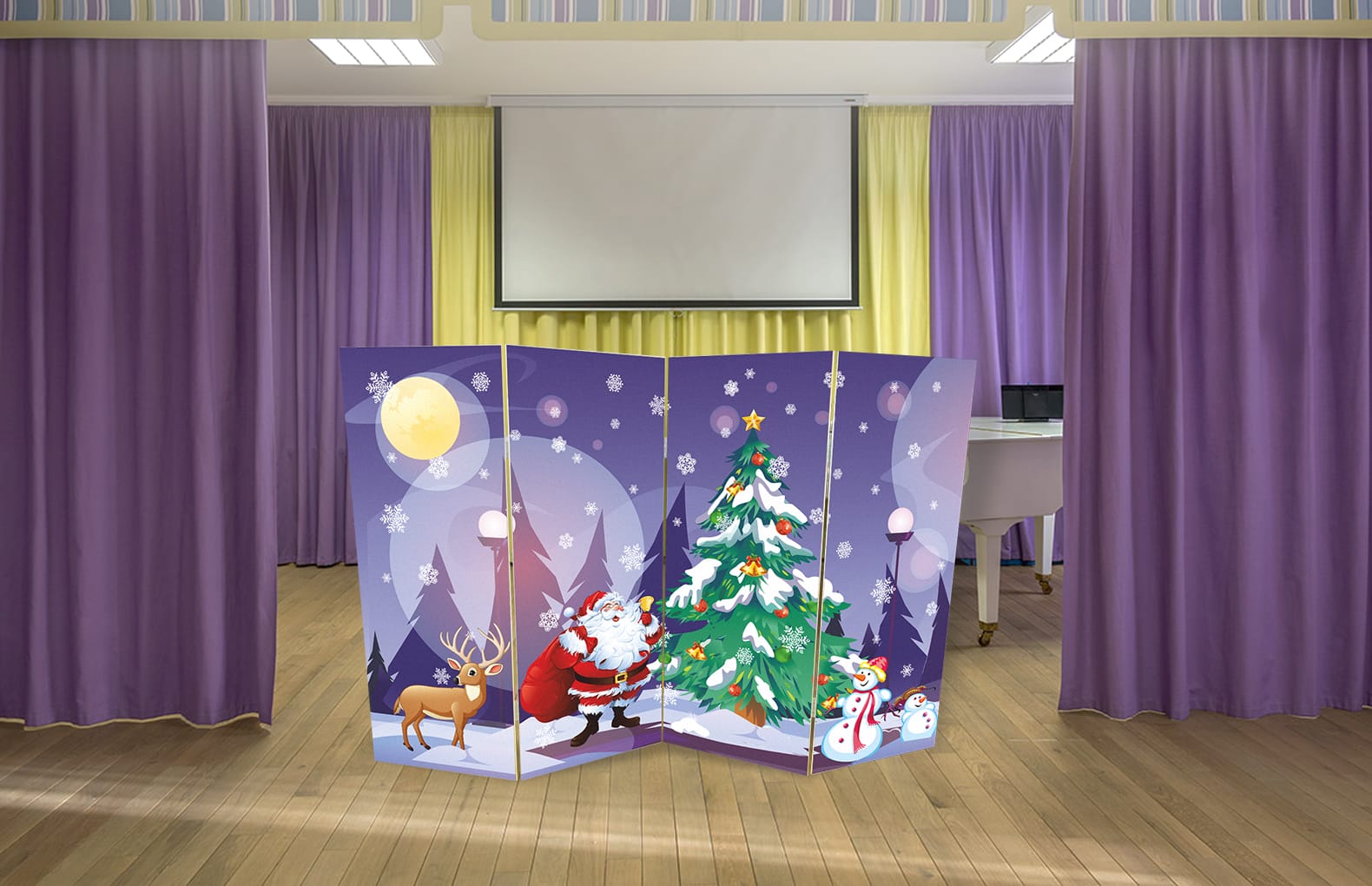В комплекте:Двусторонняя ширма "Рождество-Лес", размер 200 см х 140 см , подставки под декорации