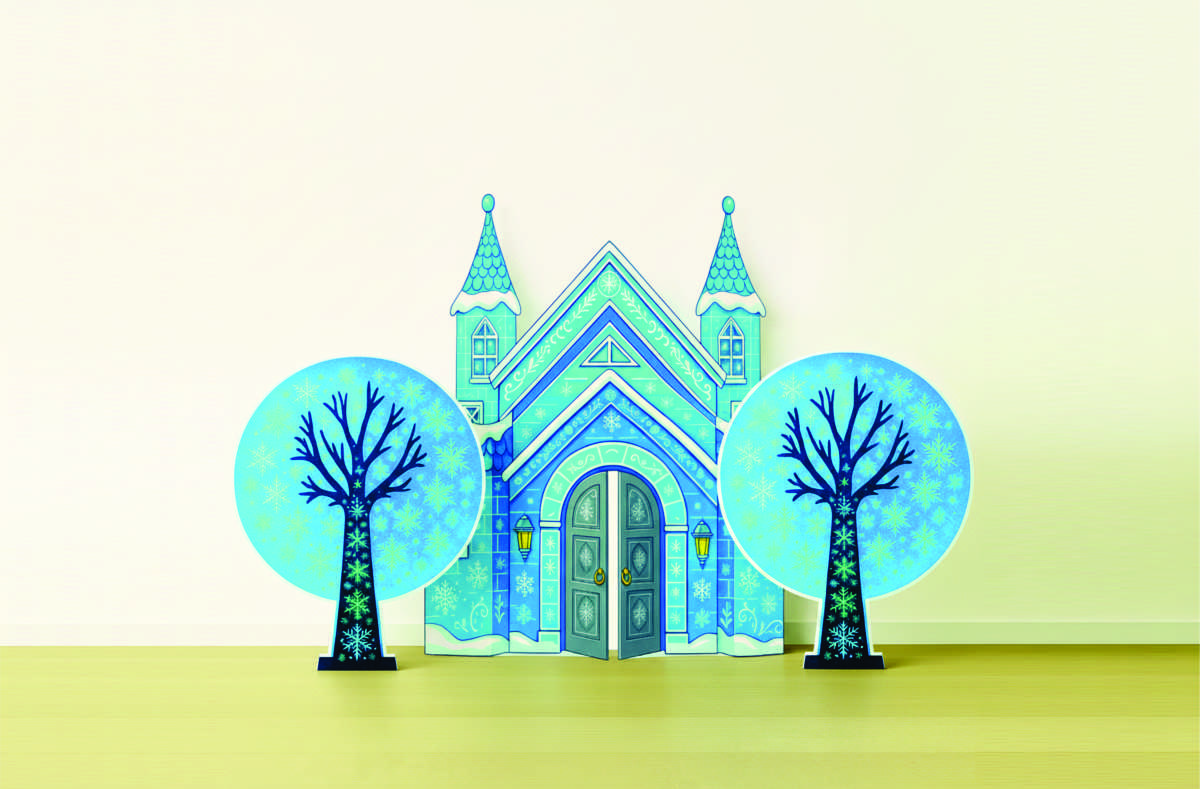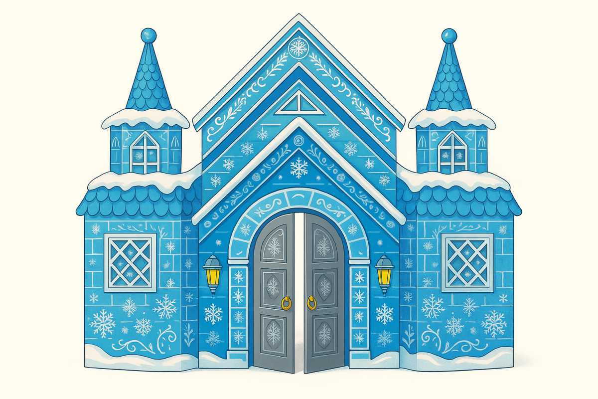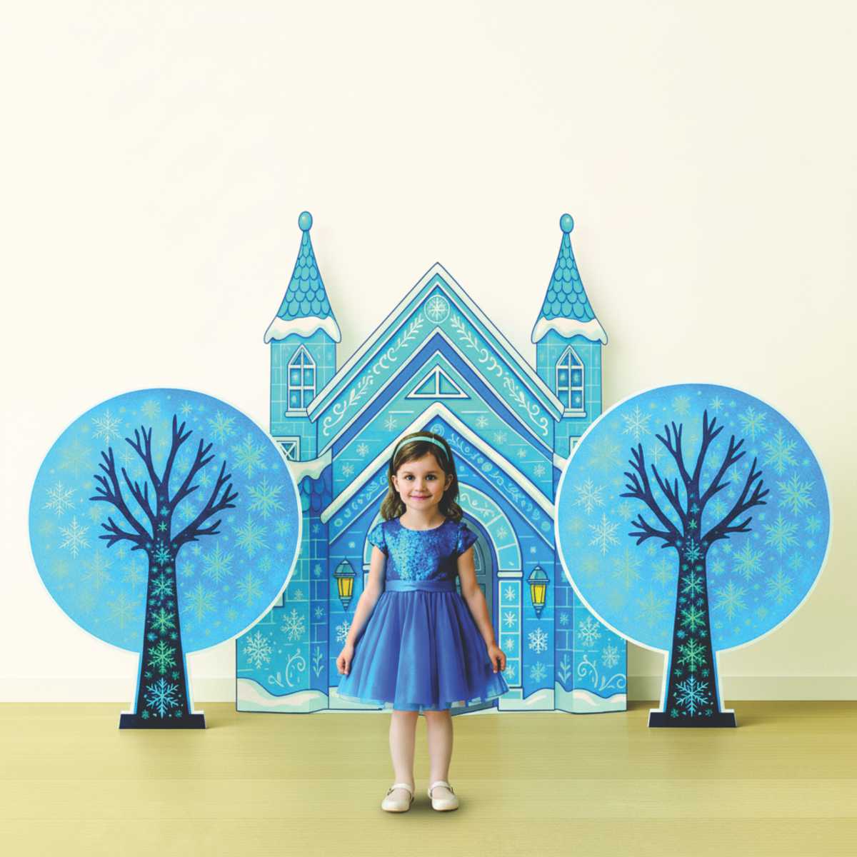Декорация выполнена в холодных, завораживающих оттенках голубого и белого, идеально передающих атмосферу ледяного царства. Фасад замка украшен изящными морозными узорами, резными элементами и множеством снежинок разной формы. Приветливо приоткрытые серебряные ворота и светящиеся фонарики по бокам приглашают маленьких гостей окунуться в мир волшебства. Две башенки с остроконечными крышами и заснеженная кровля добавляют конструкции сказочный и завершенный вид.