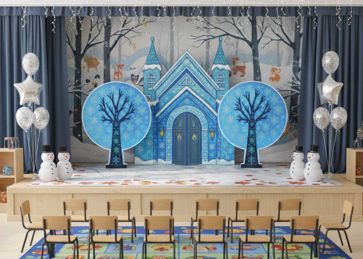 Декорация мгновенно переносит детей и взрослых в мир любимой сказки и служит прекрасным фоном для ярких и эмоциональных новогодних фотографий. Подходит для украшения сцены, игровой зоны или входа в зал.