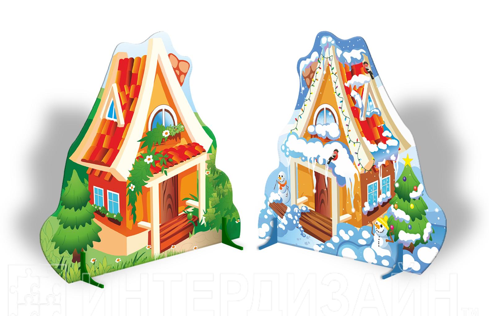 В комплекте:Двусторонняя декорация "Домик. Лето-Зима" , размер 140 см х 110 см, 2 подставки под декорацию