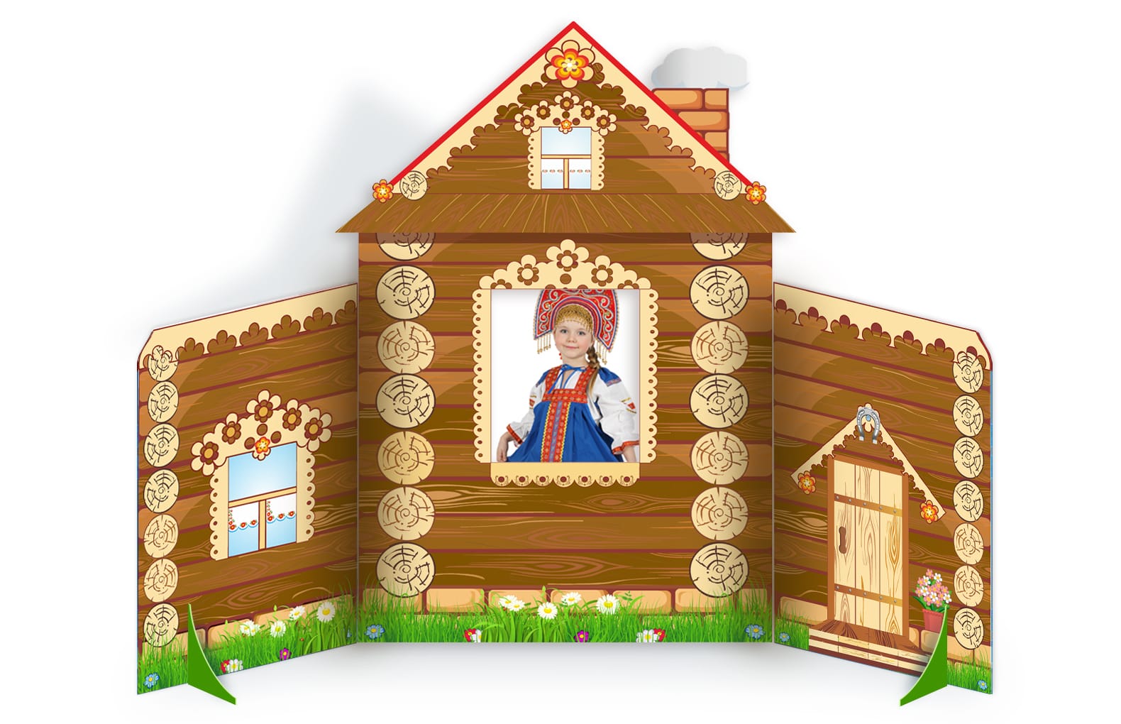 В комплекте:Двусторонняя декорация "Русская избушка. Зима-Лето", размер общий 250х160 см, центр 117х160 см, боковые 65х93 см, окно проём 385х455 мм, подставки под декорацию