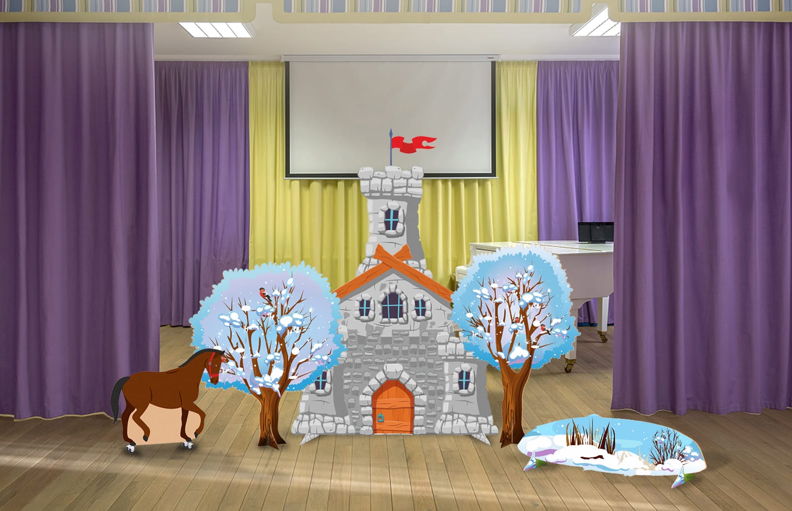 Размеры:декорация "Замок" 115х150 см, двусторонние декорации Деревья 84х98 см и 71х112 см, двусторонняя декорация "Озеро" 115х30 см. декорация "Конь" 64х51 см