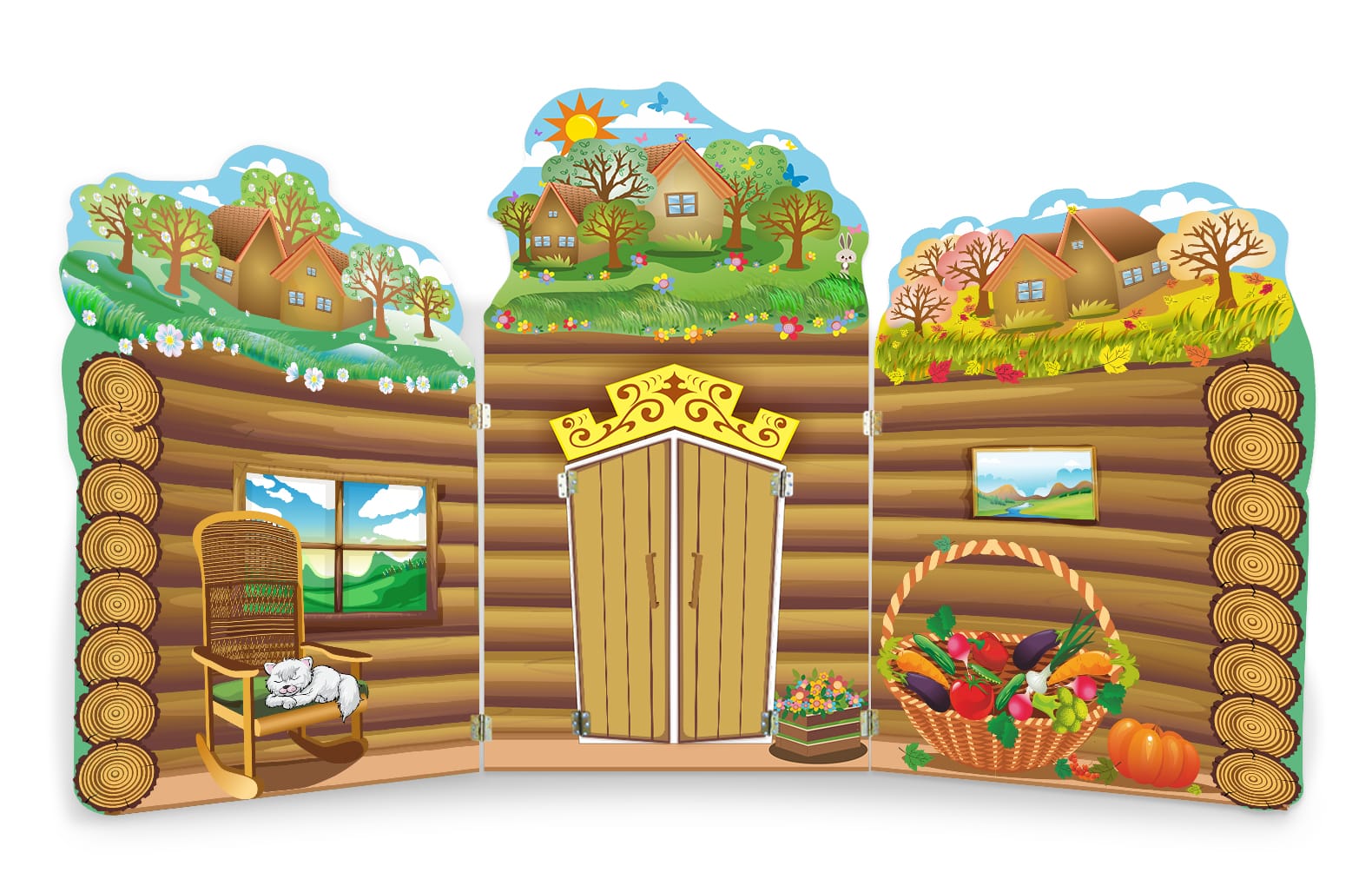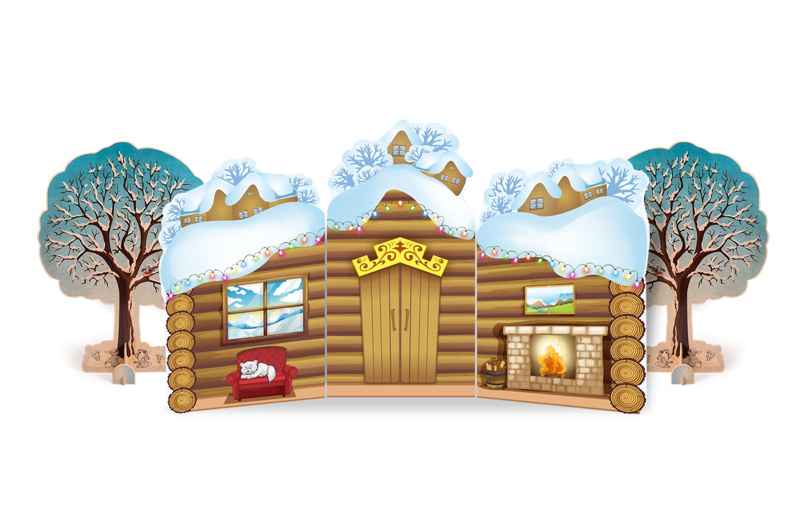В комплекте:Комплект декораций “В домике Лесовичка” :Дом со сменными магнитными элементами 310х170см ; дерево двустороннее Осень-Зима 90х120см (2 шт). Общий размер 400х170см