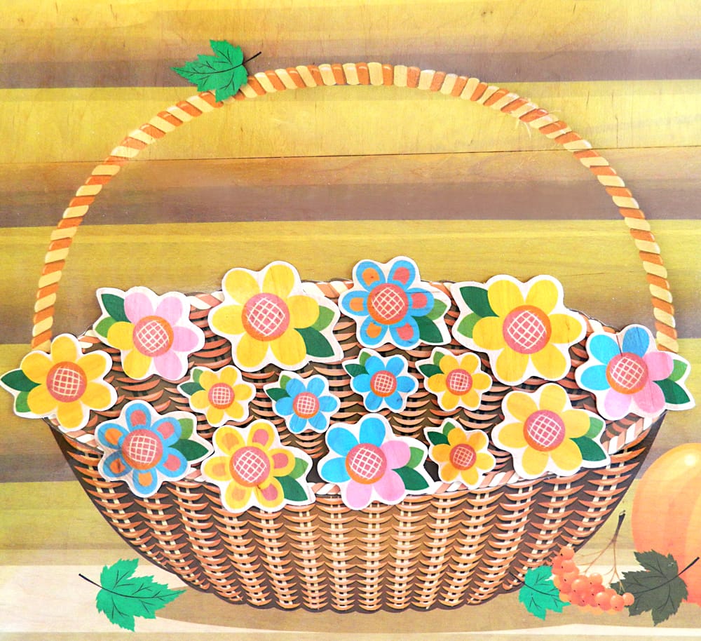 Одна сторона дома - зимняя, вторая - многосезонная. Обратите внимание, что на корзину крепятся магнитные элементы. Если это весенний утренник, то цветы, если осенний - то овощи.