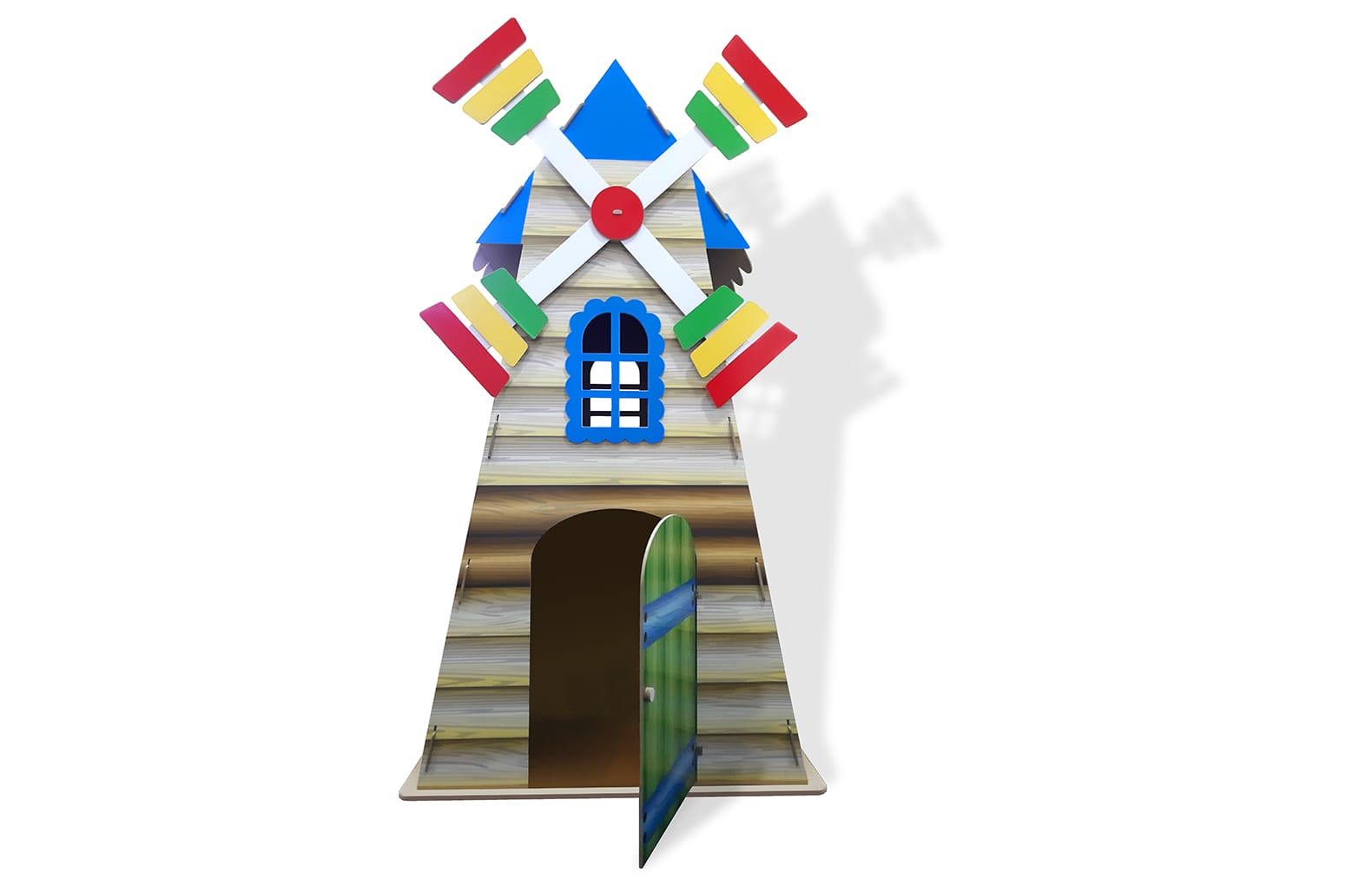- декорация Мельница-дом (сняв лопасти, Вы получаете универсальный дом или башню). Дверь открывается, внутрь декорации может легко поместиться ребенок дошкольного возраста.