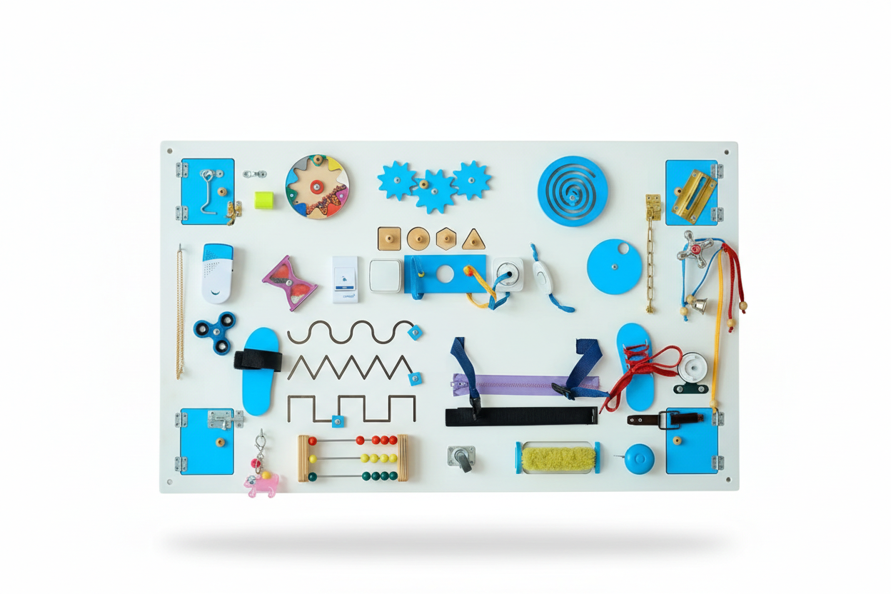 Интерактивная панель, выполненная в мягких пастельных оттенках, создана специально для гармоничного развития ребенка в спокойной визуальной среде. Бизиборд сочетает в себе тренажер для мелкой моторики и пособие по бытовой адаптации, помогая малышам осваивать повседневные действия в безопасной игровой форме.