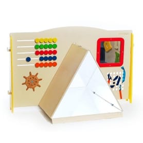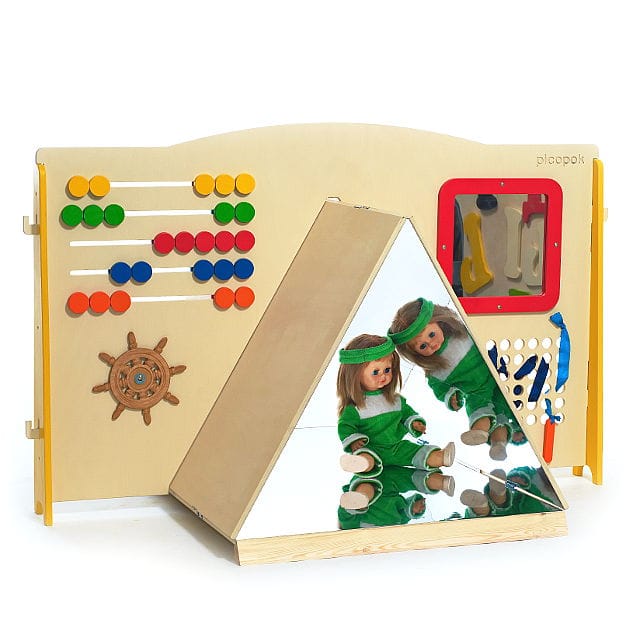 Панель с зеркальным треугольником способствует взаимодействию детей в игре друг с другом, расширению словарного запаса, развитию логики и мышления, а также поможет детям в изучении счета и цветов.