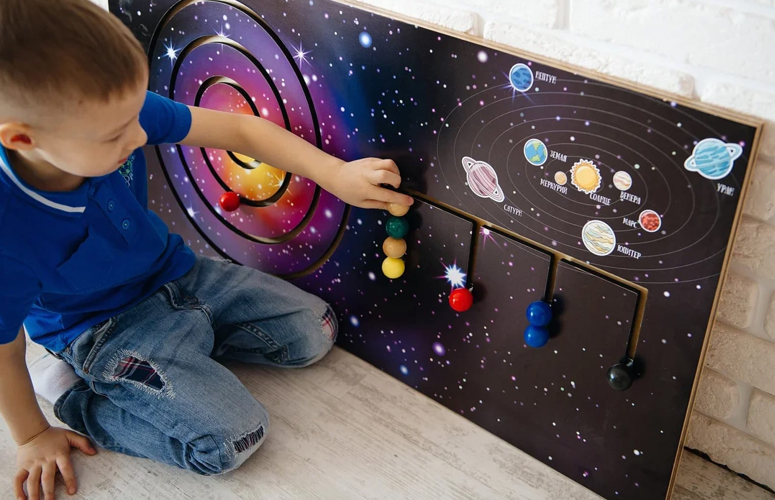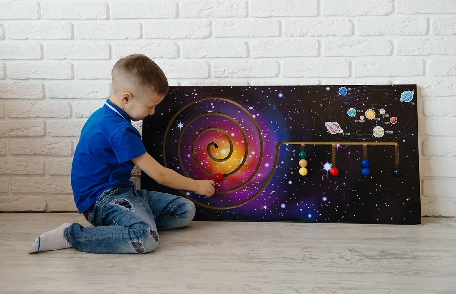 Панель является прекрасным дополнением к основной программе детского развития. Дизайн выполнен в современном космическом стиле. Цветовая гамма позволяет заниматься, не напрягая глаза. В ходе занятий улучшается память, развивается логическое мышление.