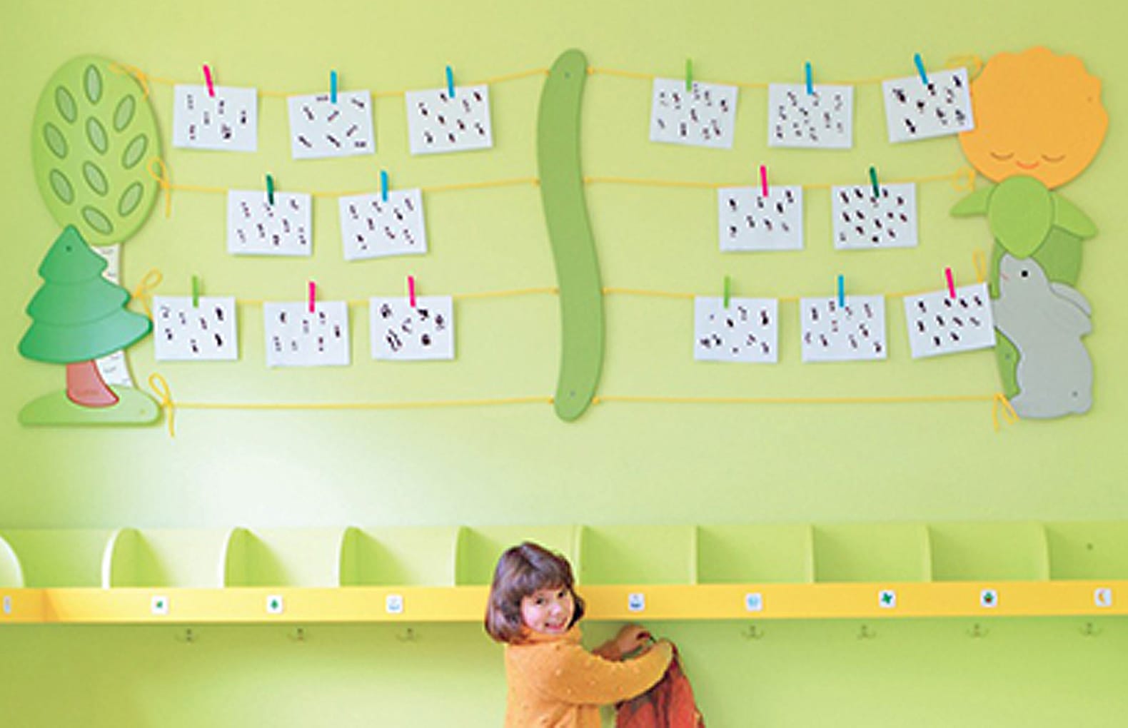 Рисунки и информация крепятся на элементы с помощью декоративных прищепок.