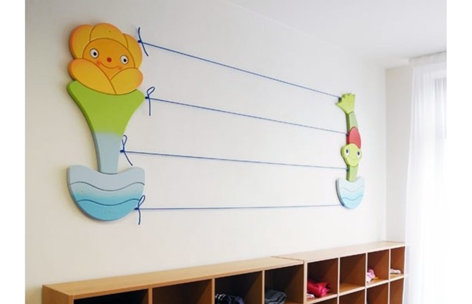 Рисунки и информация крепятся на элементы с помощью декоративных прищепок.