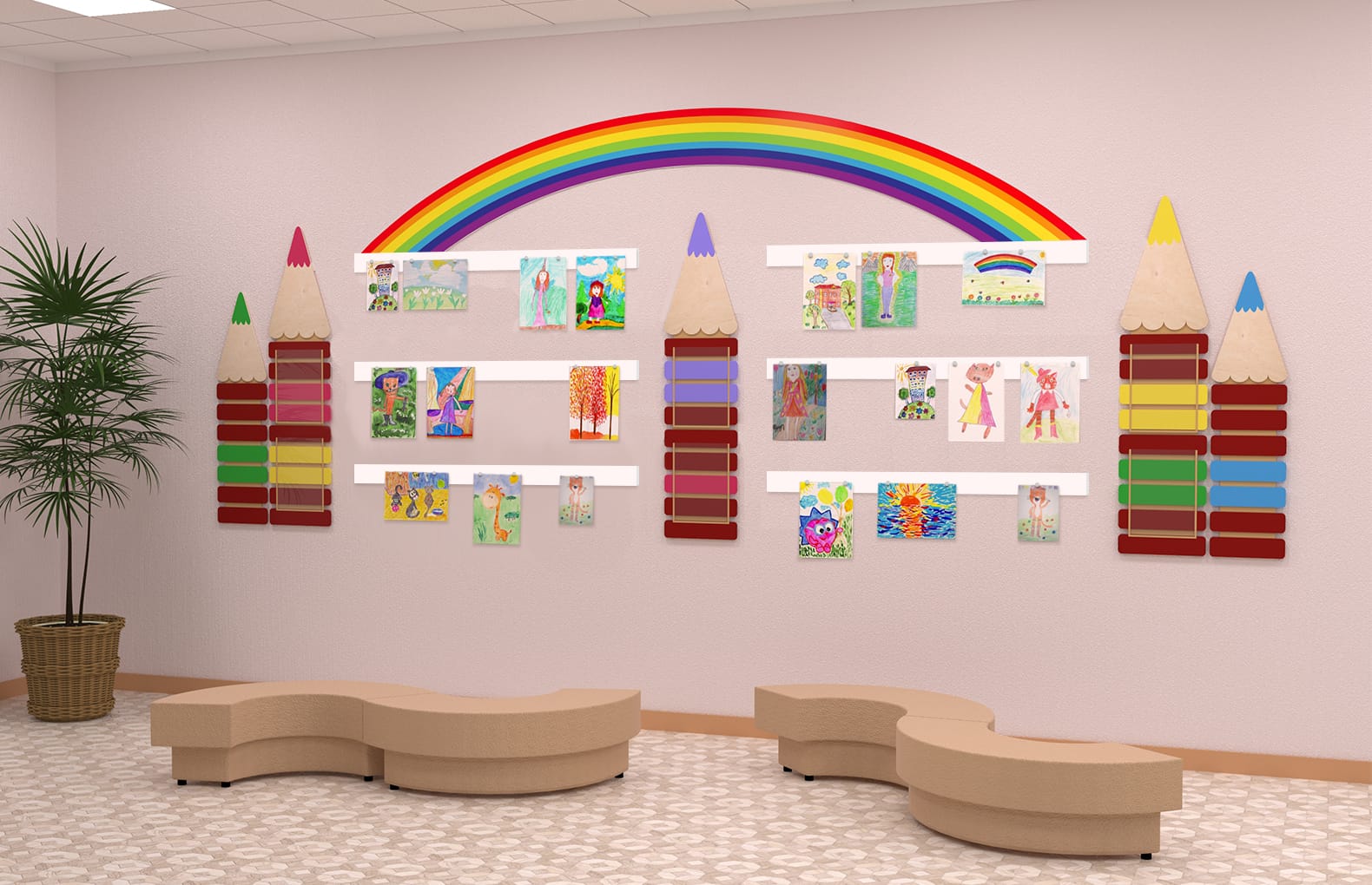 Размерыобщий размер композиции на фото 430х189 см. Магнитные панели 100х7 см (6 шт), Радуга 287х49 см, красный и желтый карандаши 30х145 см, голубой и зеленый карандаши 25х100 см, сиреневый карандаш 30х127 см