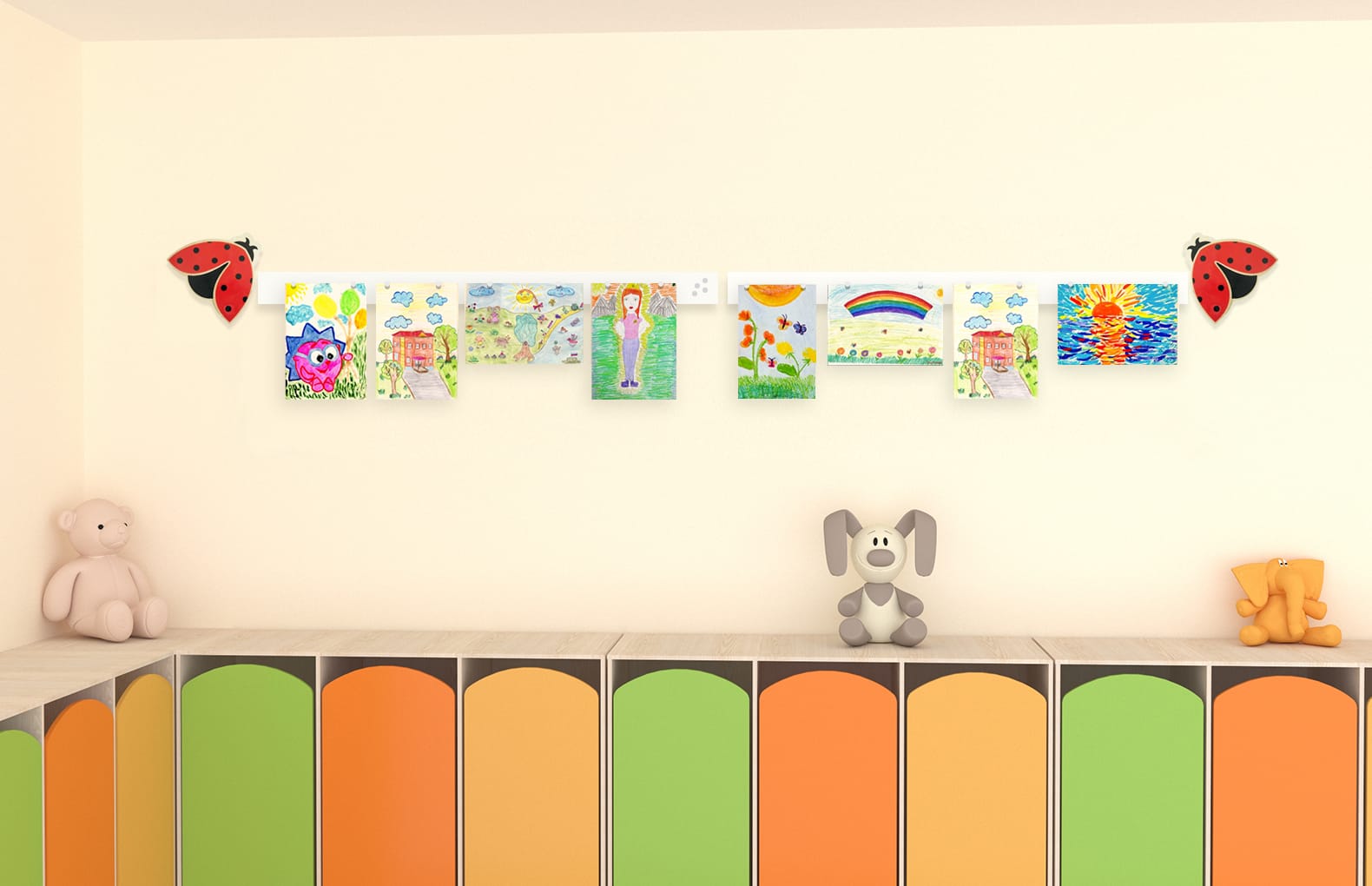 Композиция предназначена для удобной и эстетичной организации выставки детских рисунков или размещения информации для родителей.