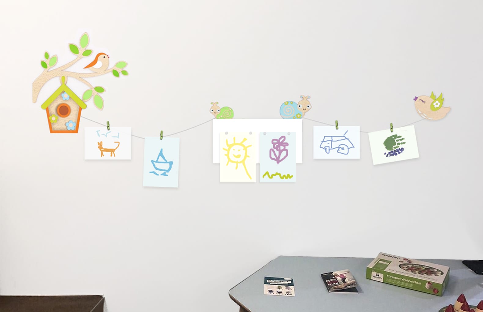 Для размещения рисунков использован трос с декоративными прищепками и высококачественная магнитная панель, к которой при помощи магнитов крепятся рисунки.