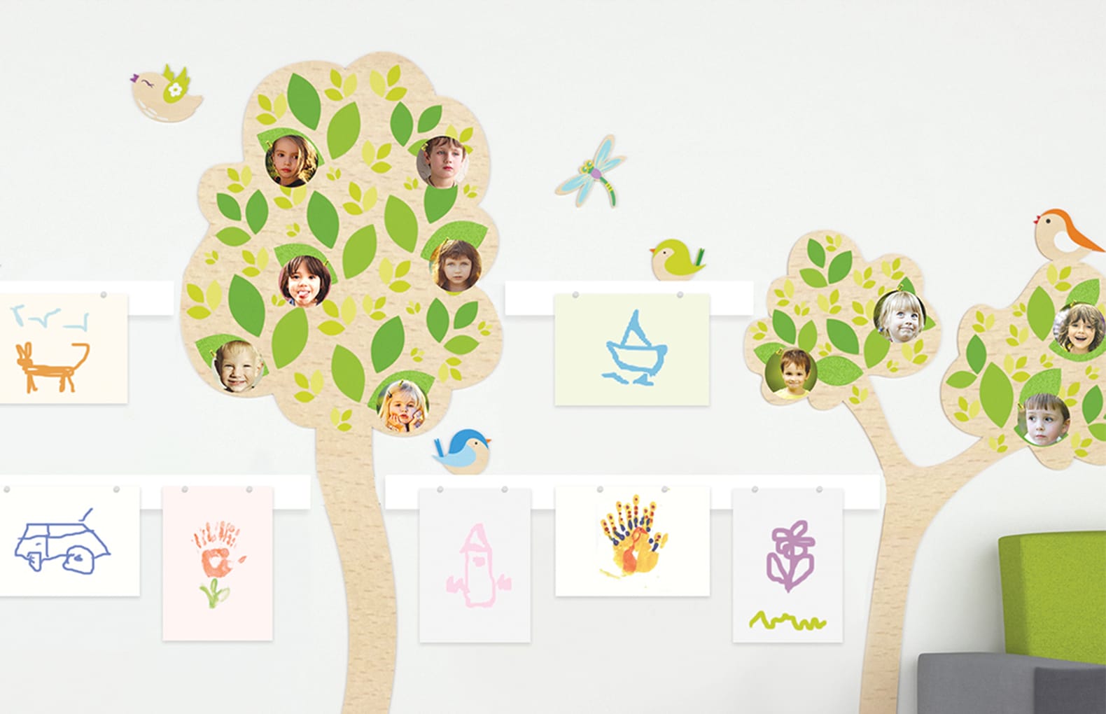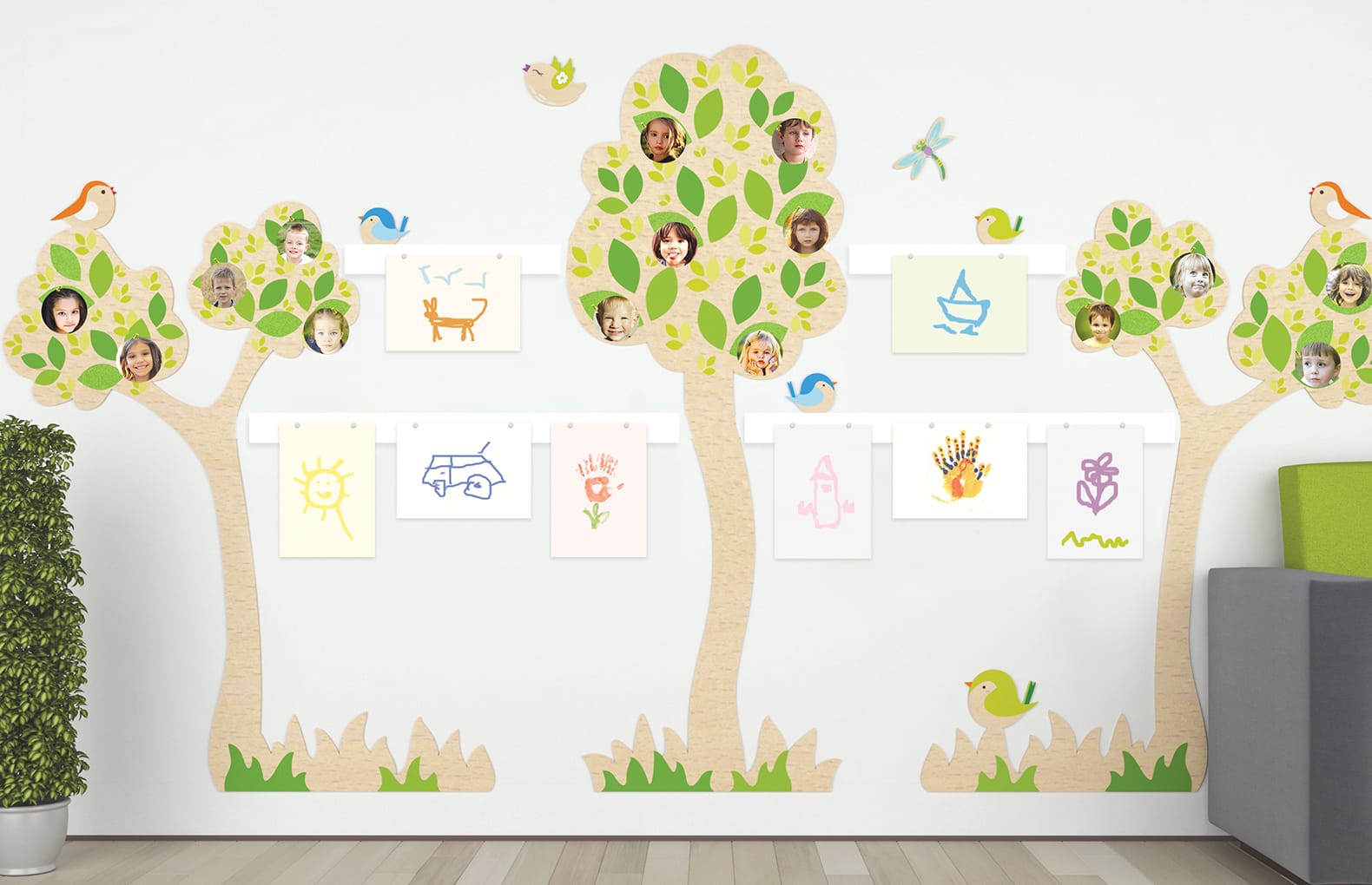 Композиция станет замечательным решением для рекреационных зон - магнитные панели позволяют оформить выставку детских рисунков или разместить любую полезную информацию, а деревья приятных пастельных тонов украшают детский интерьер и позитивно влияют на настроение.