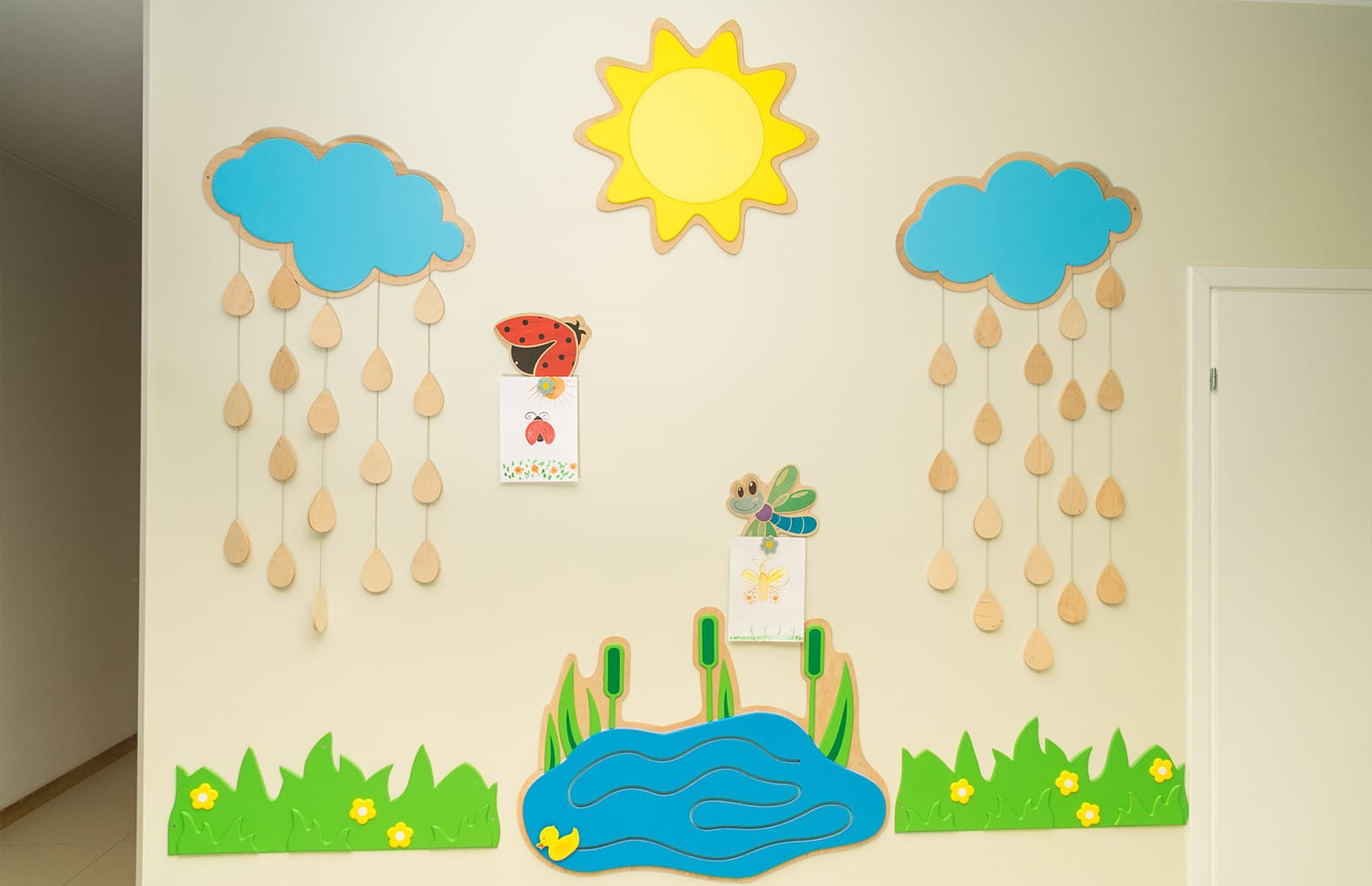 В комплекте:Солнце, тучка с капельками (2шт), божья коровка (1 шт), стрекоза, лужайка с цветочками (2 шт), озеро с камышами.