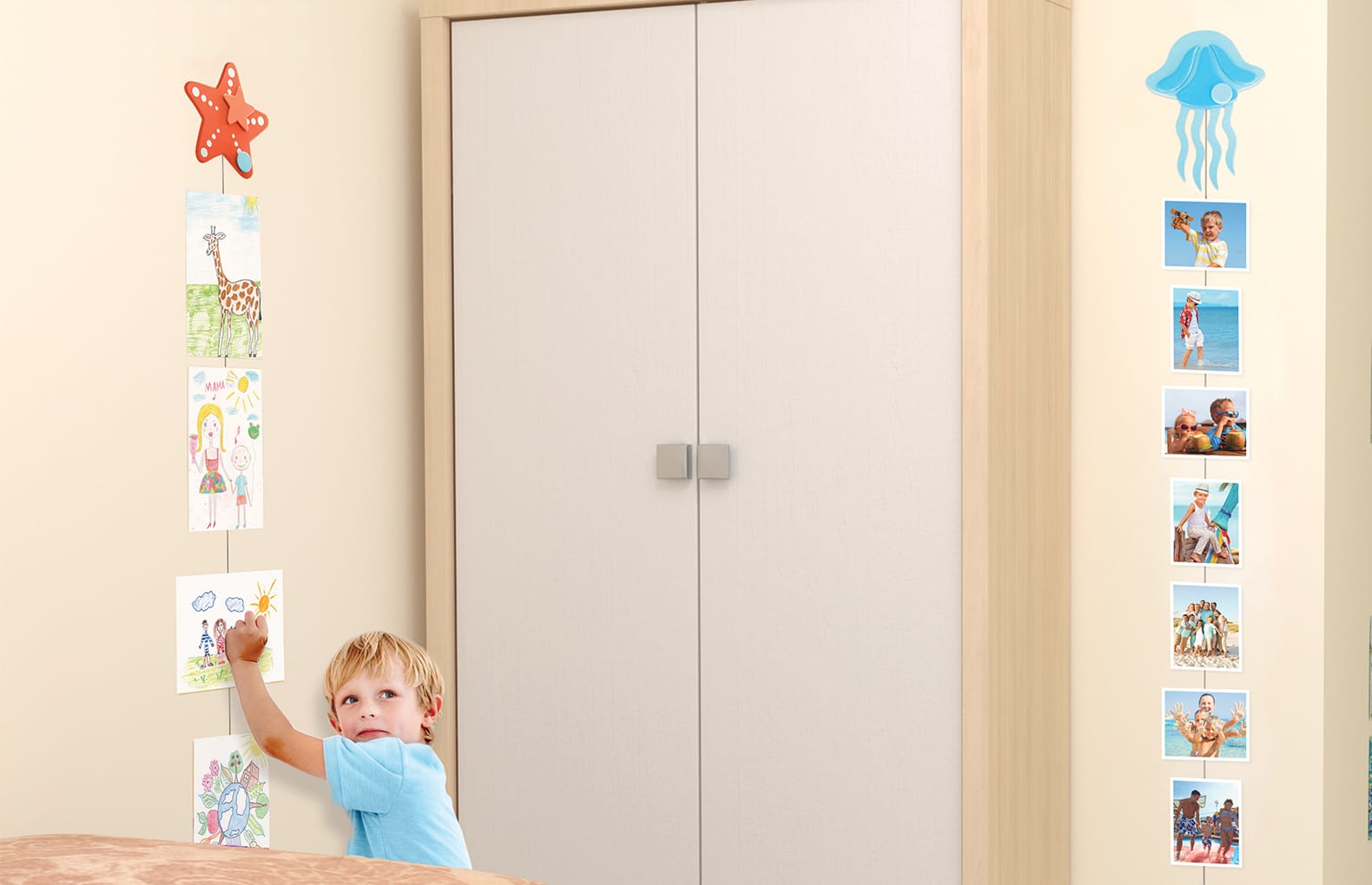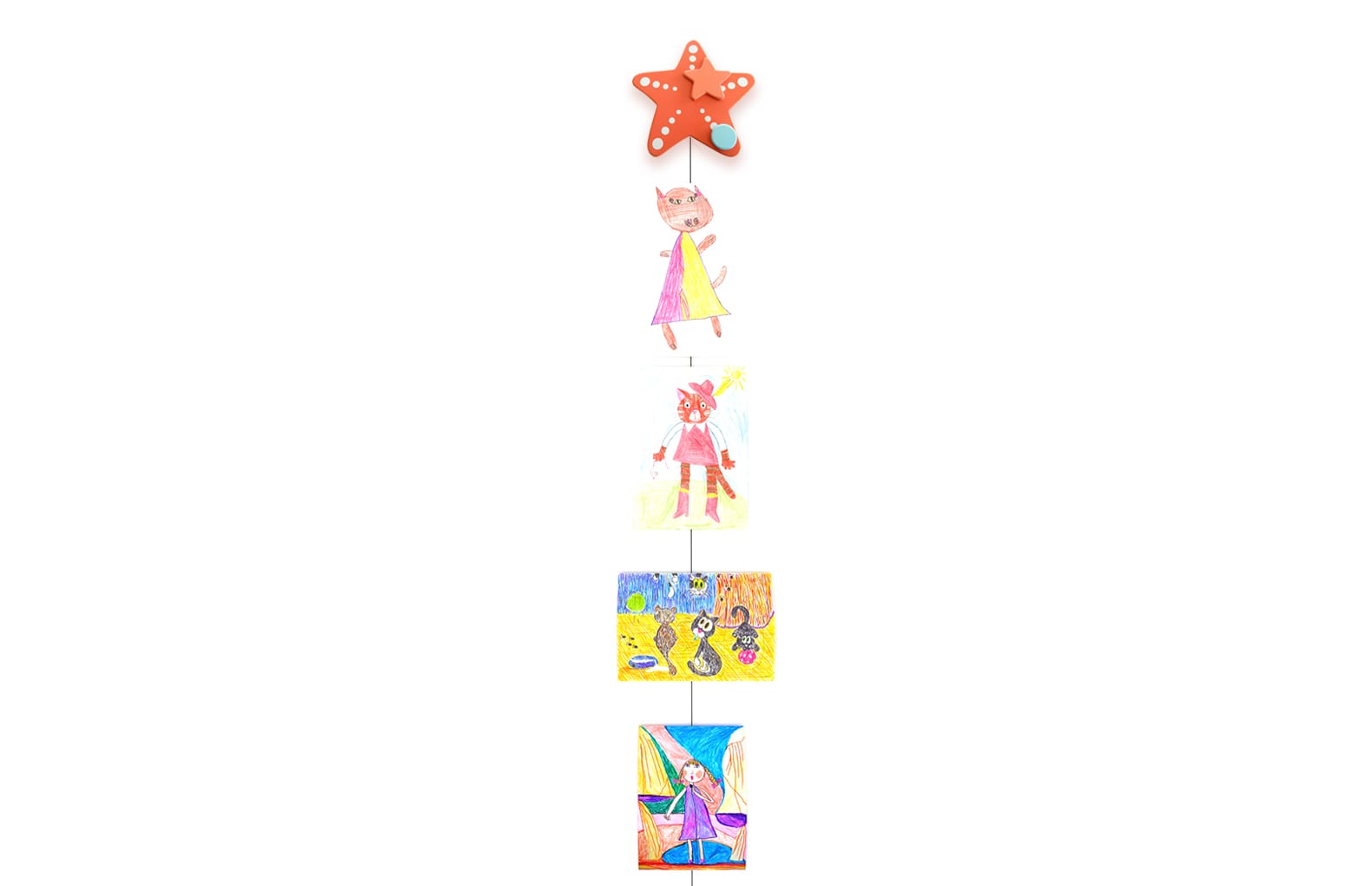 Рисунки к тросу крепятся при помощи декоративных прищепок