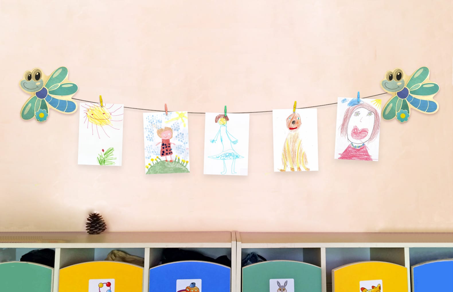 Рисунки к тросу крепятся при помощи декоративных прищепок