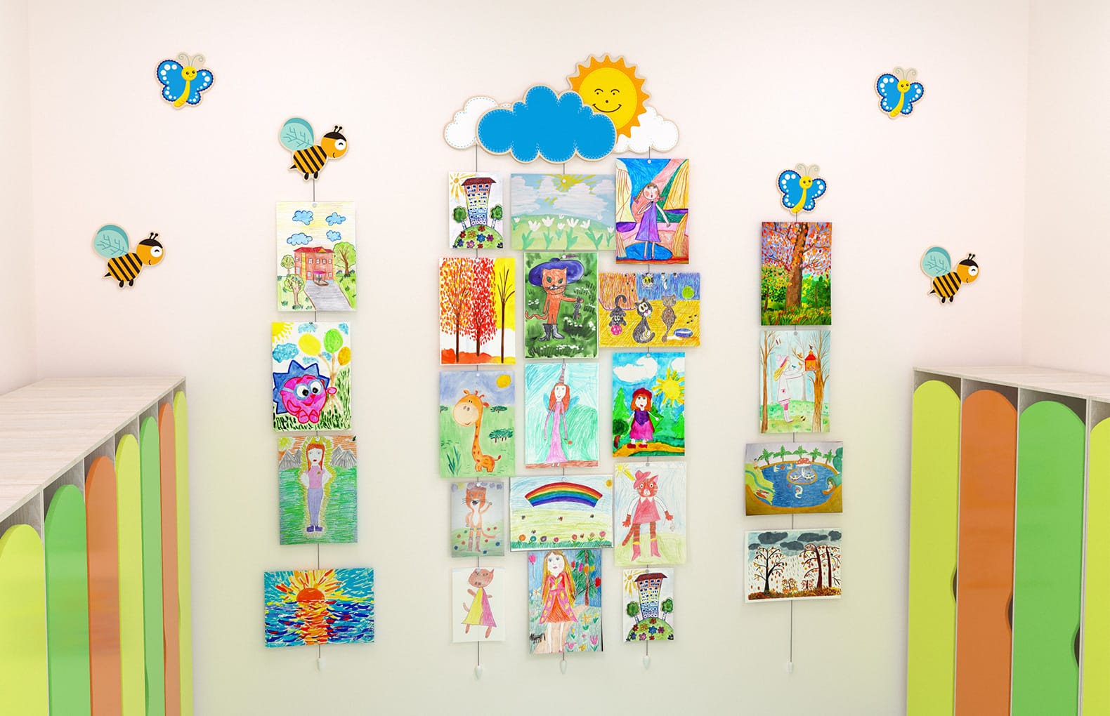 В комплектеСолнце, трос с утяжелителем (3 шт), прищепки для крепления рисунков к тросу (15 шт), фурнитура для крепления к стене