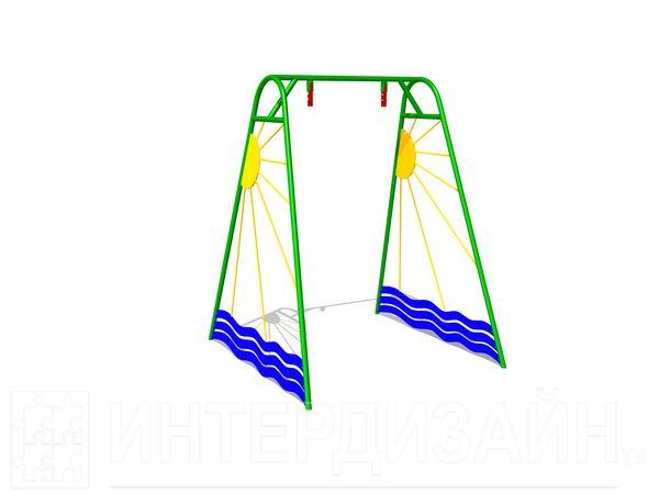Каркас одноместных детских качелей «Прибой» изготовлен из стальной трубы, и представляет собой жесткую и устойчивую конструкцию. Стойки качелей соединены металлическими связями оформленными накладками из влагостойкой фанеры.
