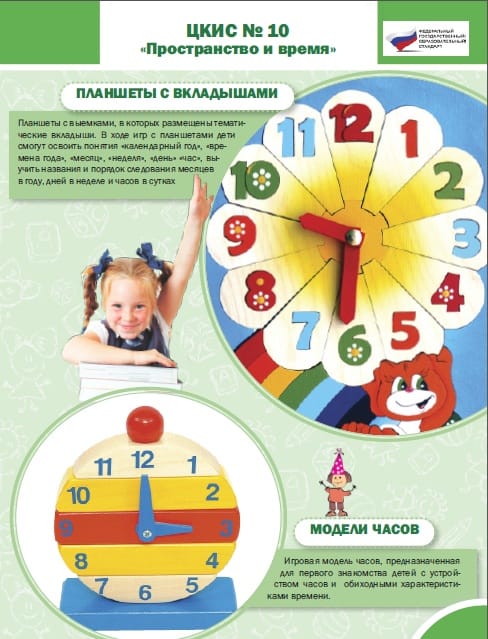 Игровые наборы карточек, позволяющие формировать представления о единицах измерения времени (час, сутки, неделя, месяц, год) и способах его определения и измерения (часы с разными циферблатами, календарь). Кроме того, с их помощью можно обучить детей ориентироваться во времени, соотносить свою деятельность с его течением, выполнять распорядок дня. .