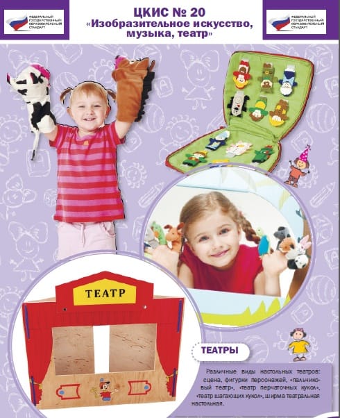 - театры, включающие сцену, декорации, фигурки персонажей, позволяющие сыграть спектакли по нескольким русским народным сказкам («Колобок», «Репка», «Три медведя» и пр.).