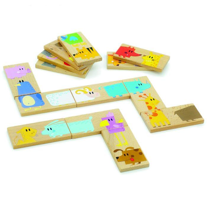 Увлекательная классическая настольная игра, вместо точек иллюстрированна различными животными, такими как лиса, баранчик, пингвин, жираф, собачка и т. д. Все зверюшки разделены на 2 части, которые необходимо сопоставить в процессе игры. Домино выполнено из дерева, рисунки нанесены красной.