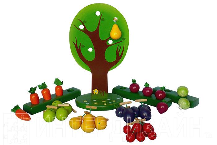 Деревянная игрушка состоит из реалистично выполненных овощей, фруктов, небольших грядок, дерева высотой 25 см и диаметром кроны 17 см, льняного мешочка. В наборе из овощей можно найти две капусты, четыре свёклы и моркови. А также по пять штук фруктов (груш, слив, яблок, вишен).