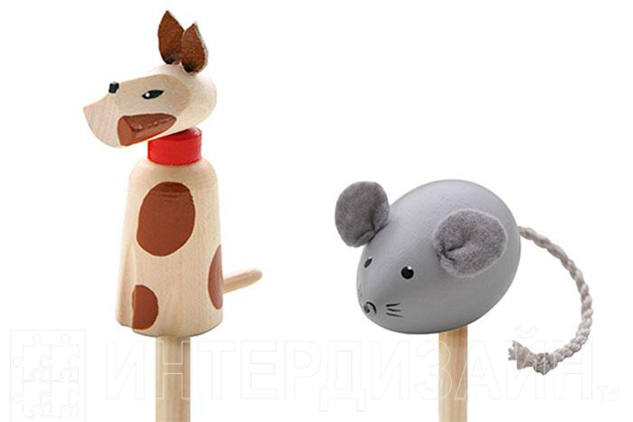 Фигурки собачки и мышки спокойных тонов, изготовленные из дерева, имеют мягкие, приятные на ощупь ушки. Игрушки хорошо сидят на пальчиках детей и стимулируют мелкую моторику рук, память, речь. С куклами животных можно организовать сказочное представление, во время которого у ребёнка вырабатывается усидчивость, развивается воображение, фантазия, пополняется словарный запас. Это прекрасный тренажёр для формирования координации движения и приобретения уверенности в себе.