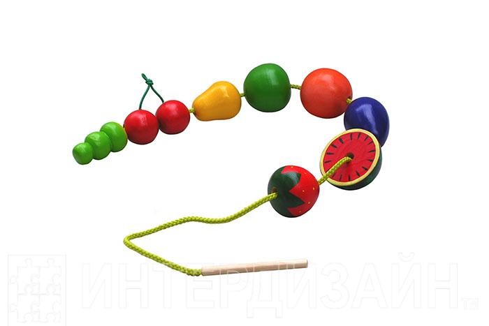 Один из вариантов развивающих игр со шнуровкой — «Фруктовый червячок», рекомендуют для малышей от 1,5 лет. Яркая игрушка, изготовленная из дерева, знакомит детей с основными цветами и фруктами. Один конец шнурка - это зелёный, маленький червячок, а другой-палочка хвостик.