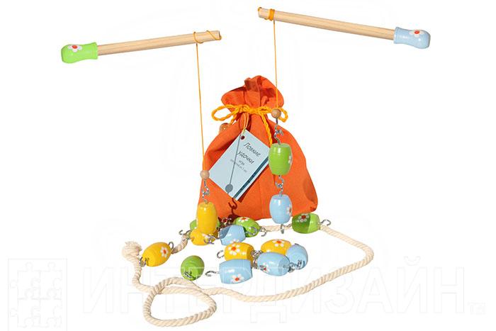 Игровой набор включает в себя льняной мешочек, верёвку-ограничитель, удочки (2 шт.) и разноцветные рыбки (15 шт.) в виде деревянных фигурок с крючками на обоих концах. У малышей-рыболовов вызывает неподдельный интерес сам процесс ловли рыб на крючок.