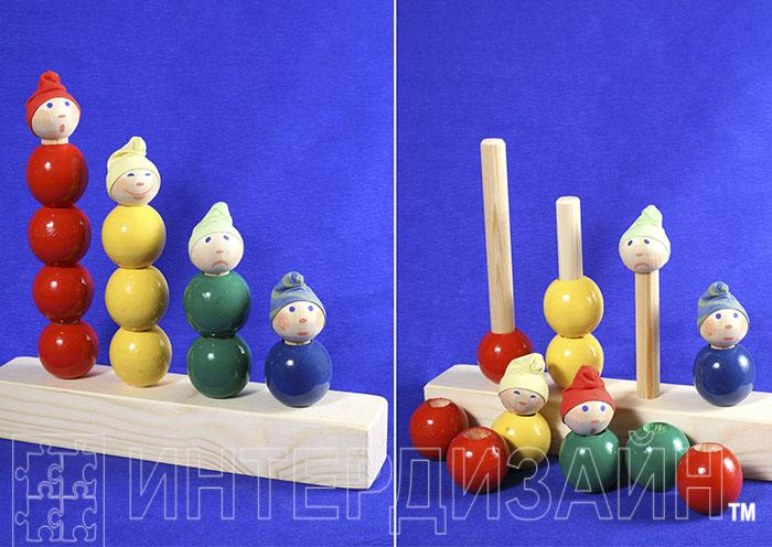 Пирамидка состоит из основания 260х55х40 мм и 4 разных по высоте стержней диаметром 16 мм. На стержни надеваются разноцветные шары диаметром 50мм. На окончания стержней выглядывающих из шара надеваются головки петрушек. Игрушка способствует развитию мелкой моторики, координации движения, логического мышления, ориентирования в пространстве, тренирующая зрение и память. Благодаря игре с пирамидкой, малыш учится обобщать и сортировать мелкие детали, распределяя их по цвету на разных стержнях.