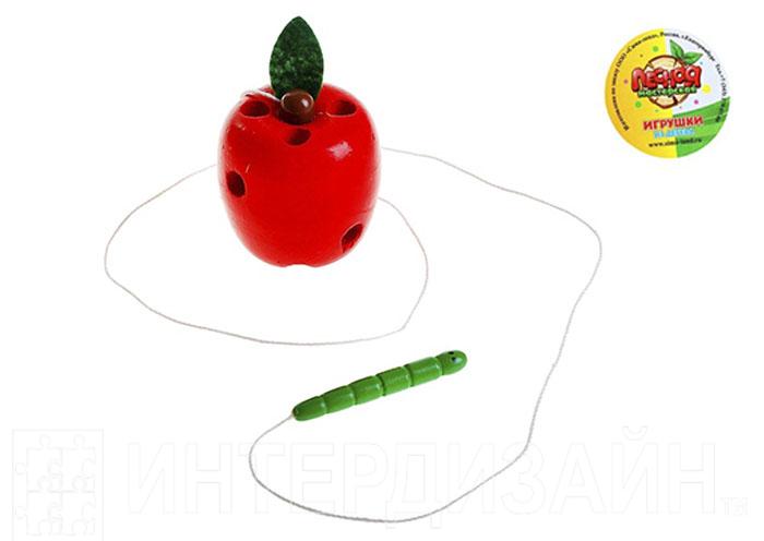 Яркая и веселая игрушка способствует развитию мелкой моторики рук и координации движений. Само яблочко изготовлено из дерева и имеет 6 отверстий для шнуровки. С помощью деревянного червячка и шнурочка малыш изучает все ходы в яблочке.