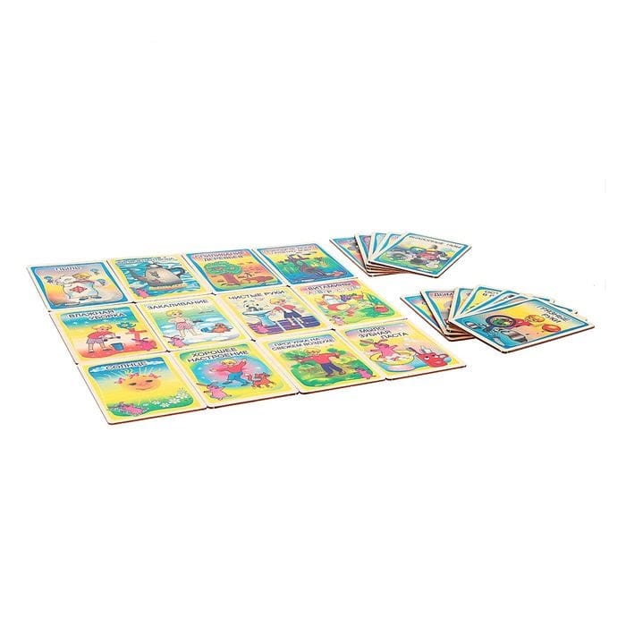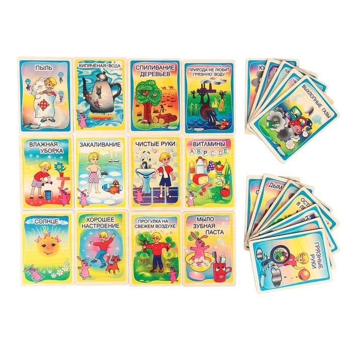 Игровой материал представляет собой красочные картинки с различными ситуациями, которые касаются правильного образа жизни и вредных привычек. В увлекательной форме и с поддержкой родителей малыш усвоит базовые знания о своём здоровье и его сохранении.