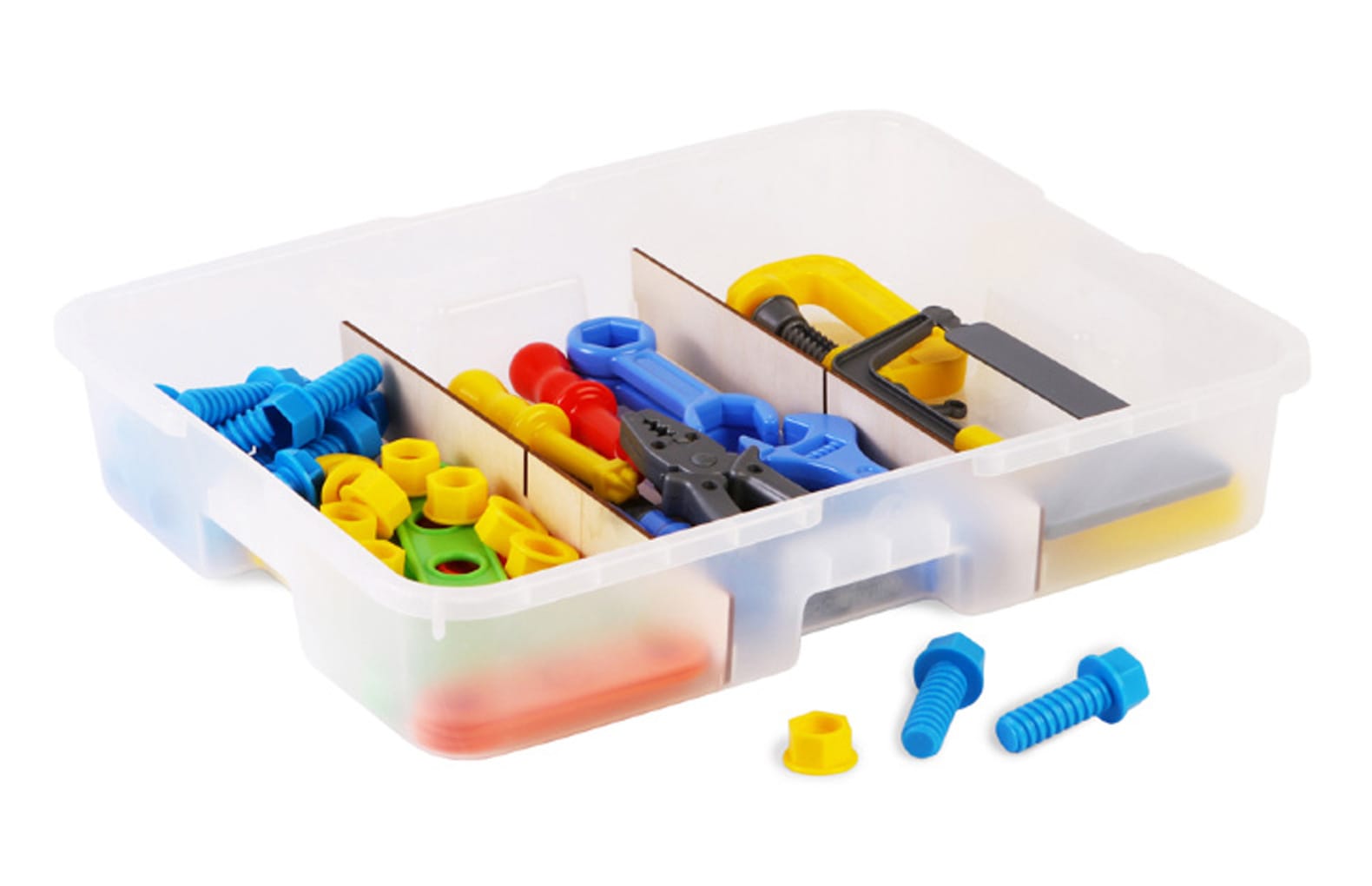 Развивающий игровой материал для сюжетно-ролевых игр дошкольников средних и старших групп ДОО. В комплекте 49 деталей для слесарных работ: гайки, болты, отвертки, гаечные ключи, ножовка, топор, молоток, плоскогубцы, разводные ключи. Занятия с инструментами развивают мелкую моторику, стимулируют воображение и социально-личностное развитие, формируют важные навыки для мальчиков и приучают к труду.