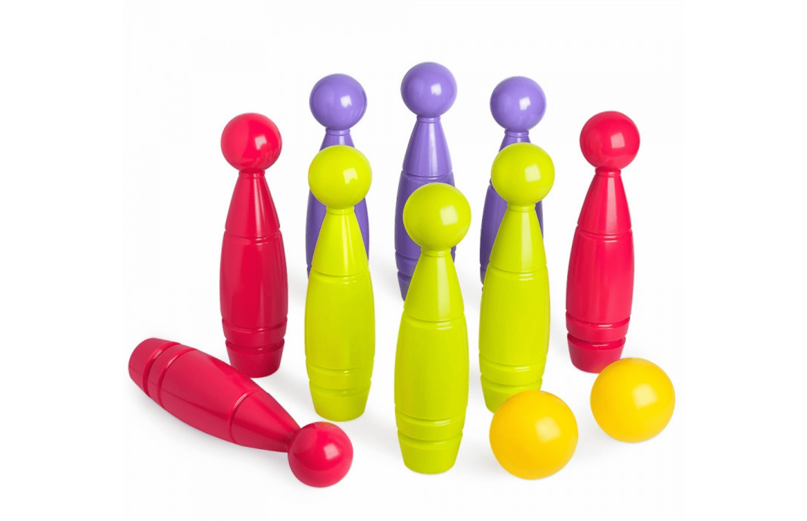 В комплект входят три набора кеглей в держателе с мячами (27 кеглей, 6 мячей), что позволяет организовать состязание нескольких команд. Держатели обеспечивают компактное и надежное хранение кеглей, а сочные краски и легкость игрушек сделают игру настоящим удовольствием для детей.