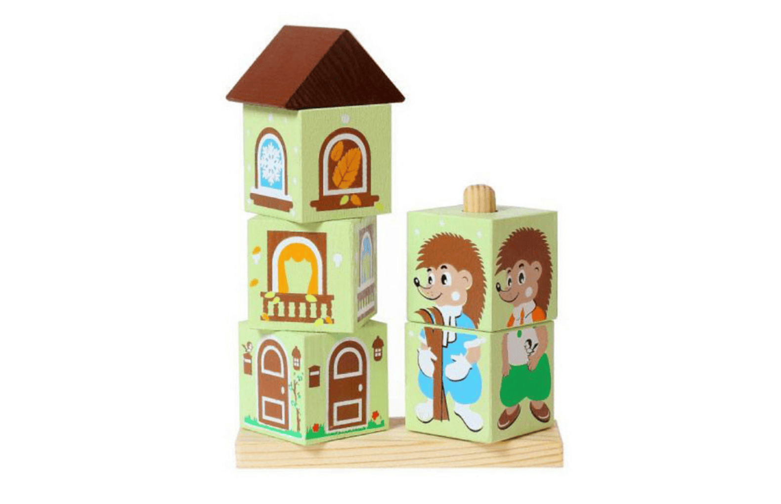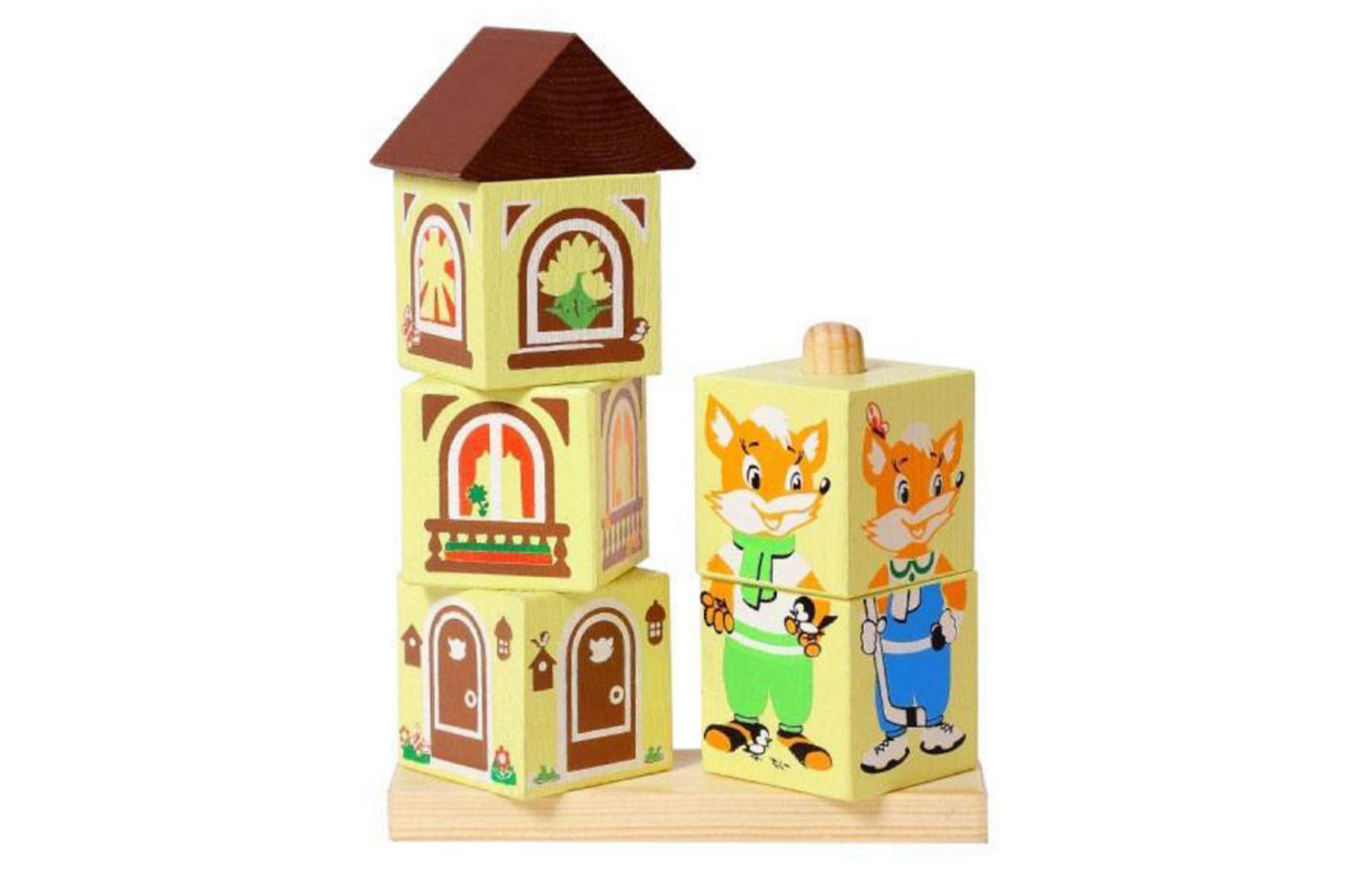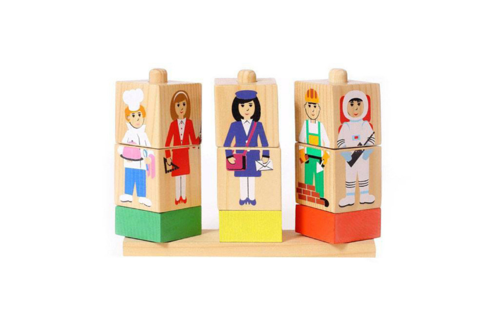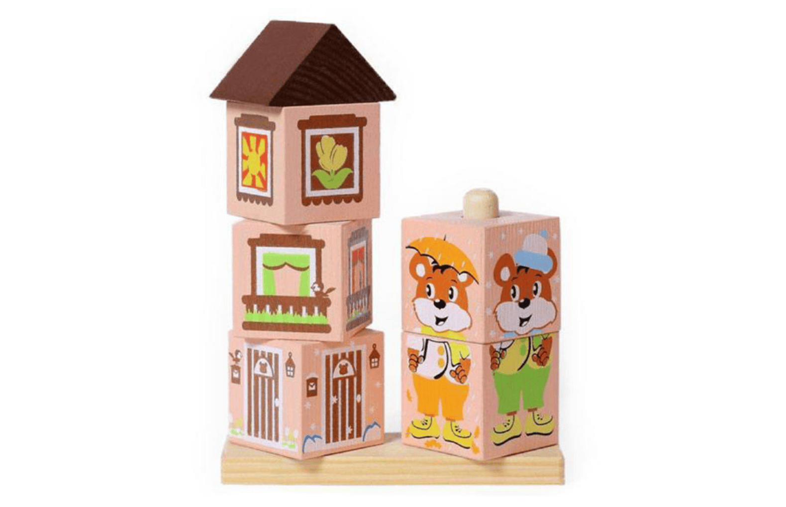 Комплект деревянных кубиков на стержне – это оригинальный развивающий набор для игровой деятельности дошкольников младших и средних групп. Занятия с данным материалом объединяют принцип работы с кубиками и пирамидами и направлены на развитие и совершенствование мелкой моторики рук, координации, навыков управления предметом. На кубики нанесены картинки в двух тематиках: дома и их жители, профессии. В процессе сборки изображений воспитанники развивают внимание, логическое мышление, а также творческие способности.