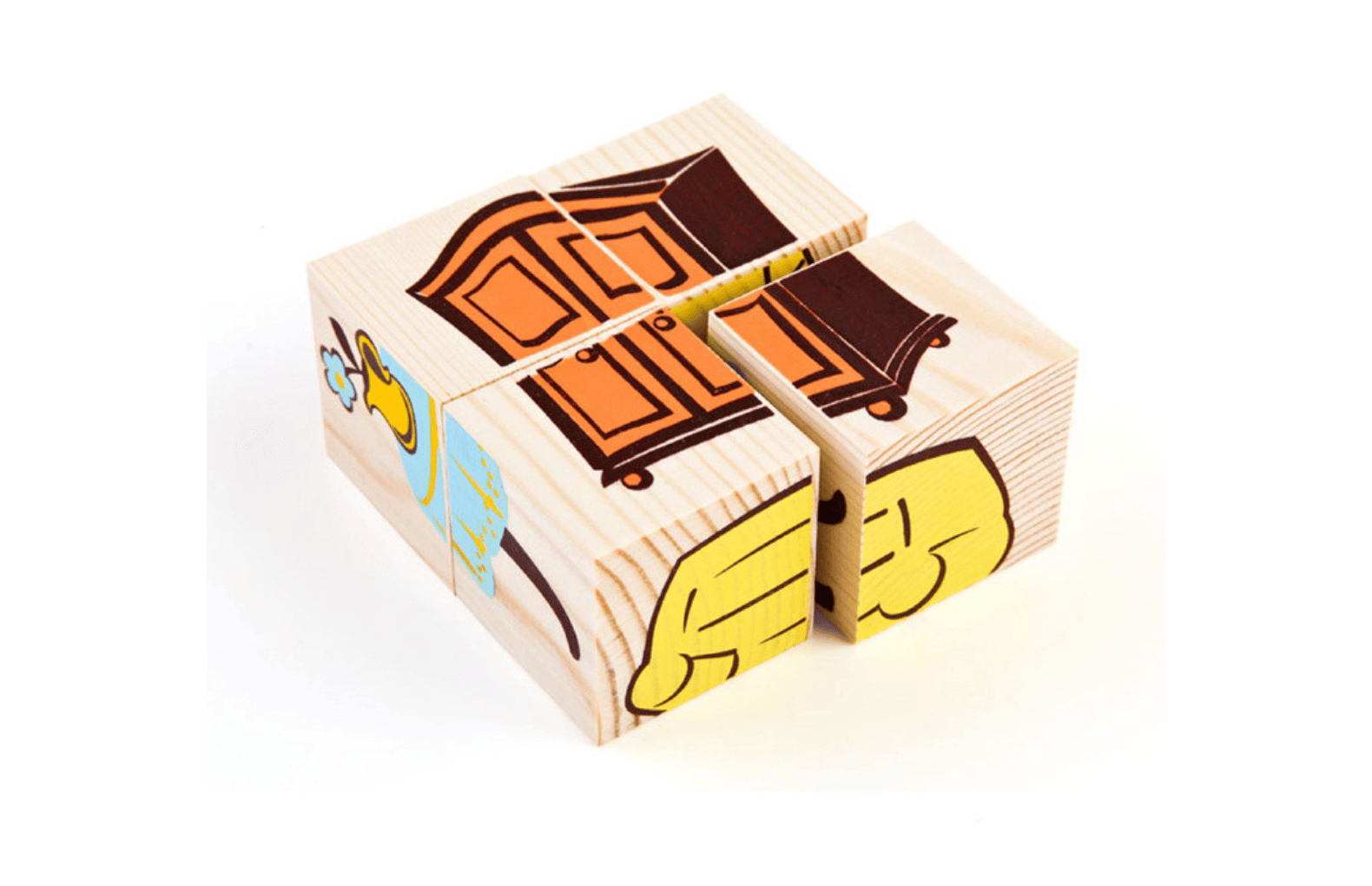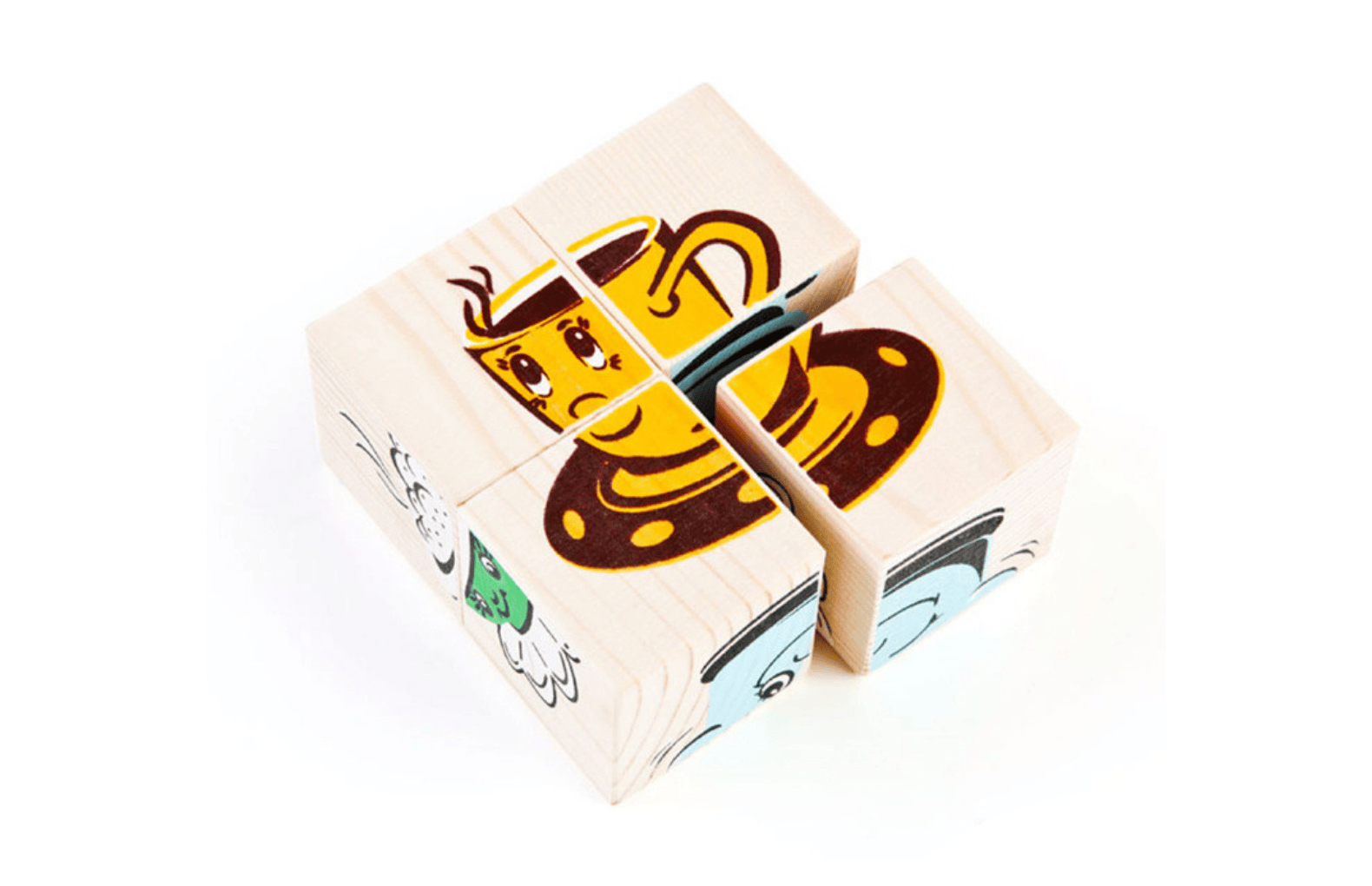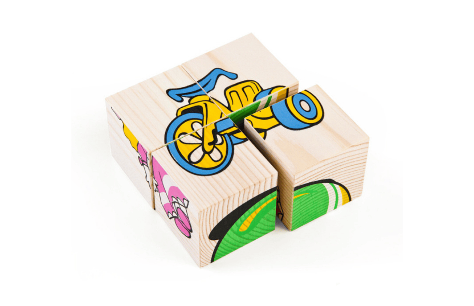 Комплект деревянных кубиков с картинками – набор для коллективного и индивидуального детского творчества в младших и средних группах ДО. В данном комплекте представлены изображения, которые собираются из 4 кубиков – упрощенный вариант для начального этапа работы с этим игровым материалом. В процессе занятий воспитанники развивают мелкую моторику рук, внимание, логику, также благотворно влияет такая работа на художественно-эстетическое развитие.