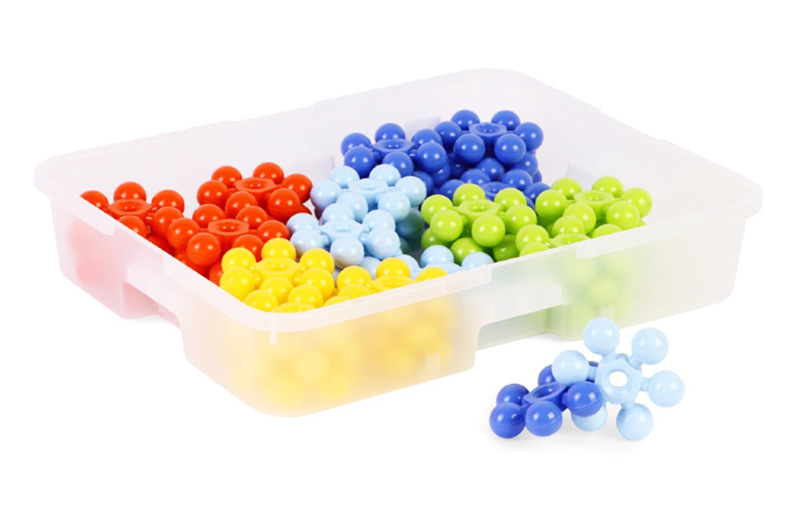 Набор деталей для конструирования для развивающих занятий и самостоятельного досуга дошкольников младших и средних групп ДОО. В составе набора 45 объемных деталей в 5 цветах, каждый элемент представляет собой кольцо с шариками. Универсальное крепление позволяет соединять детали в различных вариациях, что стимулирует мелкую моторику, воображение и пространственное мышление, развивает творческий потенциал воспитанников. Детали не имеют острых граней и мелких элементов.