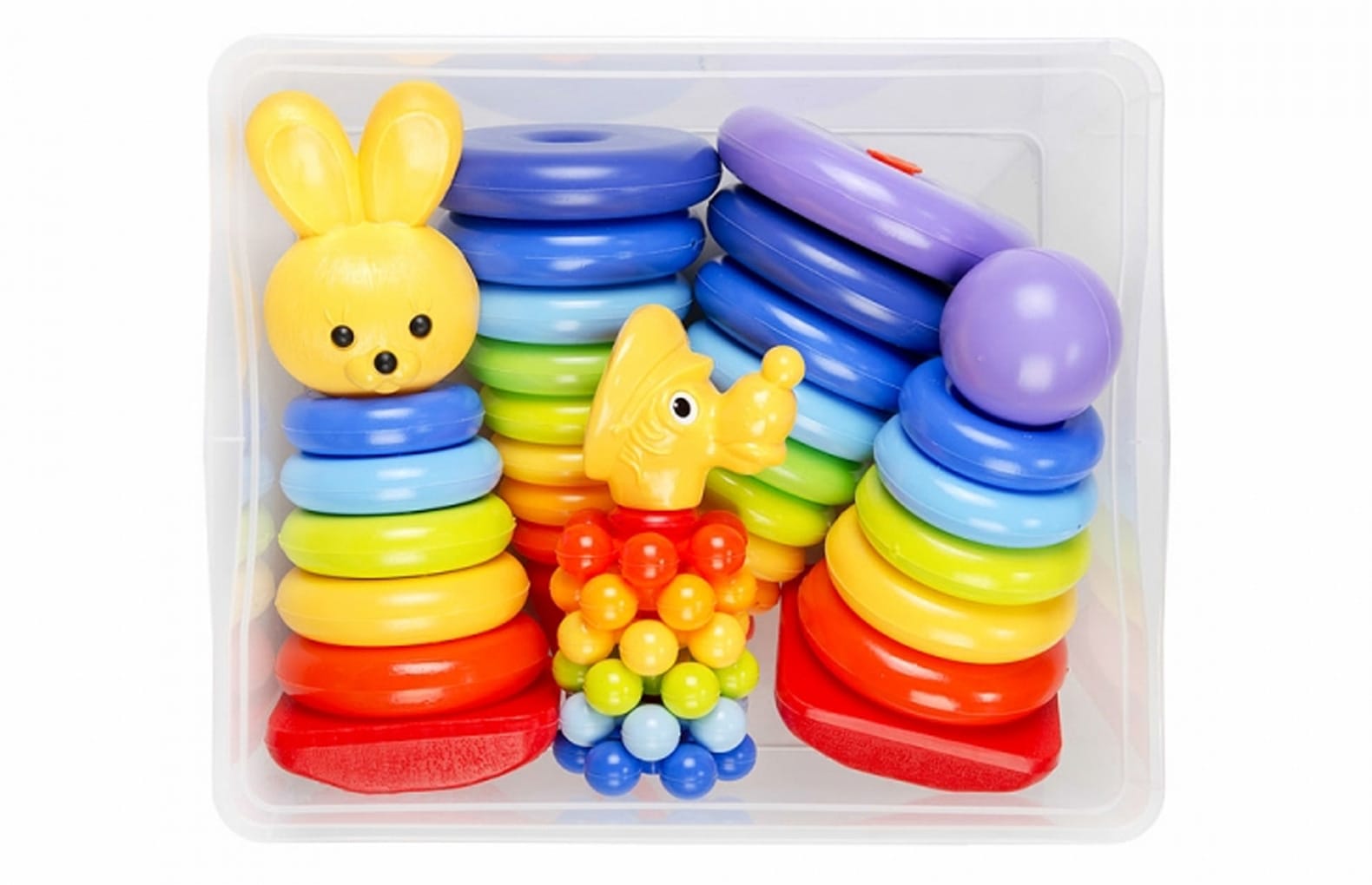 Оригинальный комплект разнообразных пирамид в пластиковом контейнере — прекрасное решение для ДОУ с небольшой площадью и удобный вариант комплектации игрового материала для любого учреждения. Набор состоит из 2 классических пирамид — базового элемента развивающего досуга дошкольников младшего возраста, а также дополнен двумя пирамидами-качалками и пирамидой с шариками. Пирамида-качалка совмещает упражнения на развитие мелкой моторики с тренировкой координации движений, а пирамида с шариками учит логически мыслить и действовать аккуратно и четко. Удобный пластиковый контейнер позволит организовать компактное хранение игрушек, которое исключает доступ пыли и позволяет штабелировать несколько наборов в подобной упаковке.