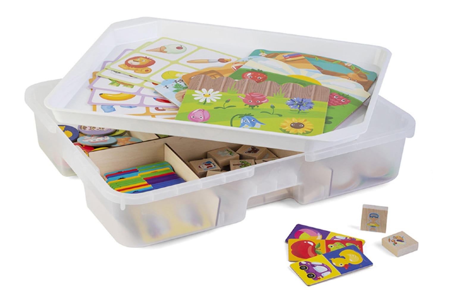 В комплекте:лото "Веселый урожай", пазлы "Собери в группы", лото "Контуры", домино универсальное, мемо, лото "Времена года", контейнер Игротека №1 / вкладыш.