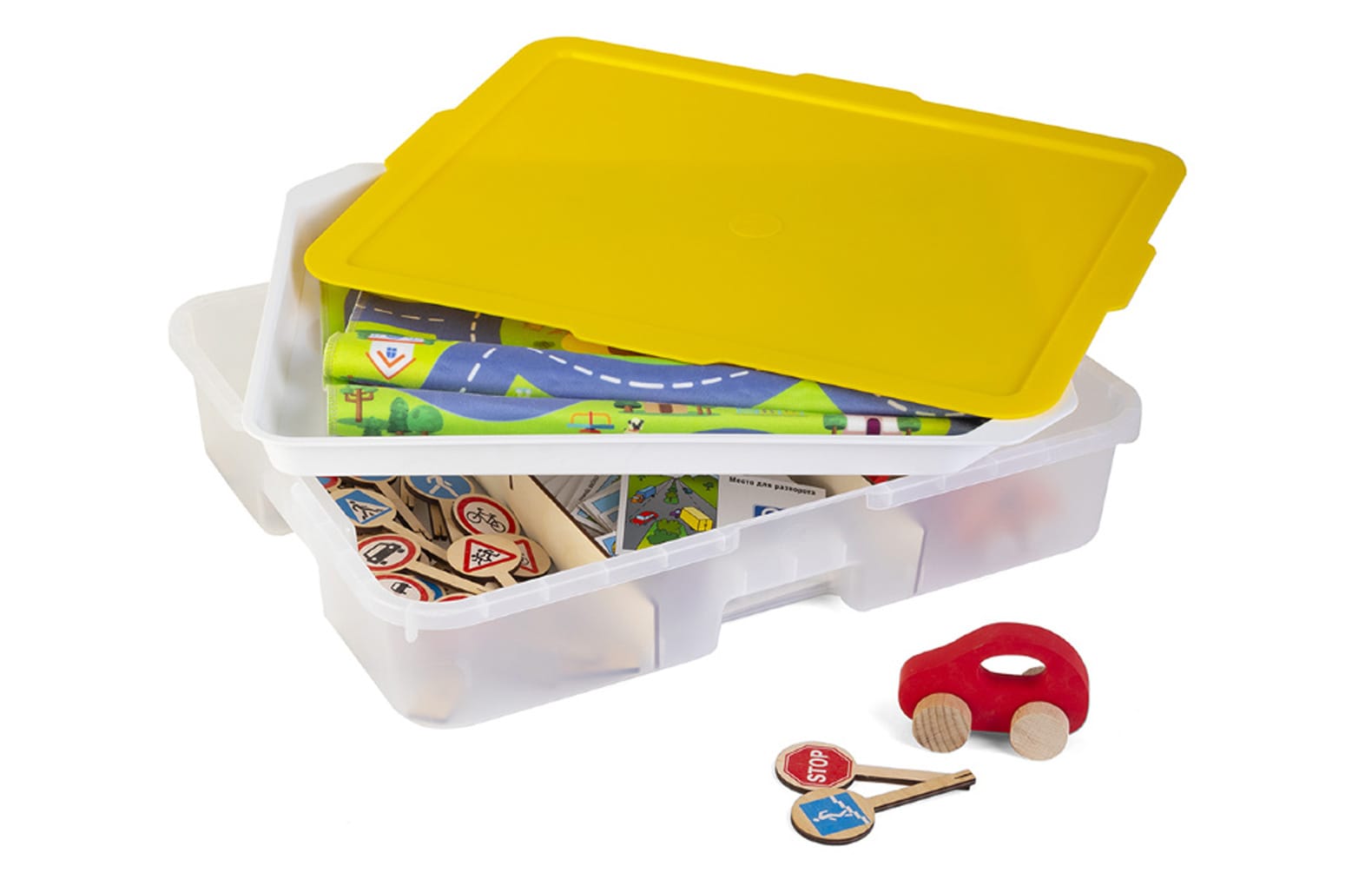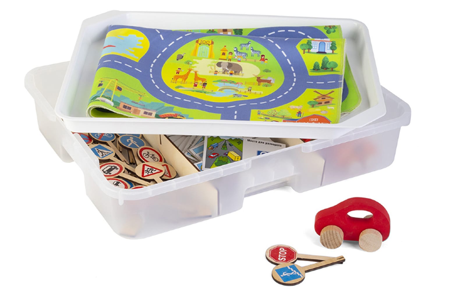В комплекте:игровой коврик "Дорога", игра "Дорожные знаки", лото "Дорожные знаки", 6 машинок, контейнер Игротека №1.