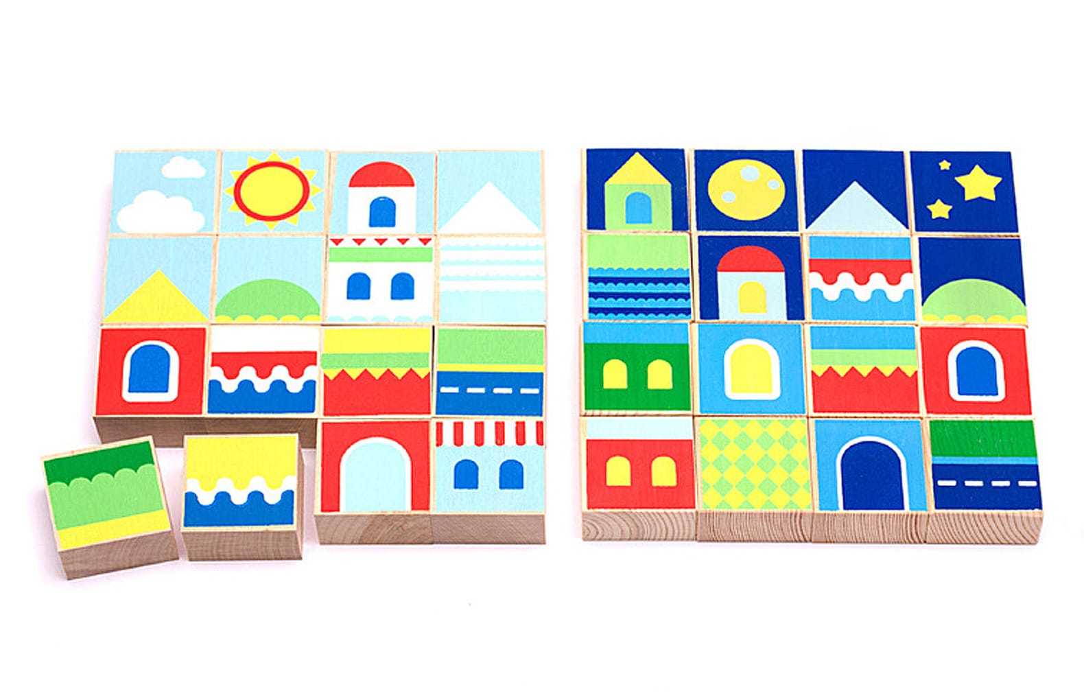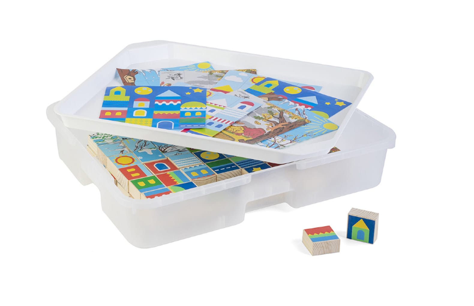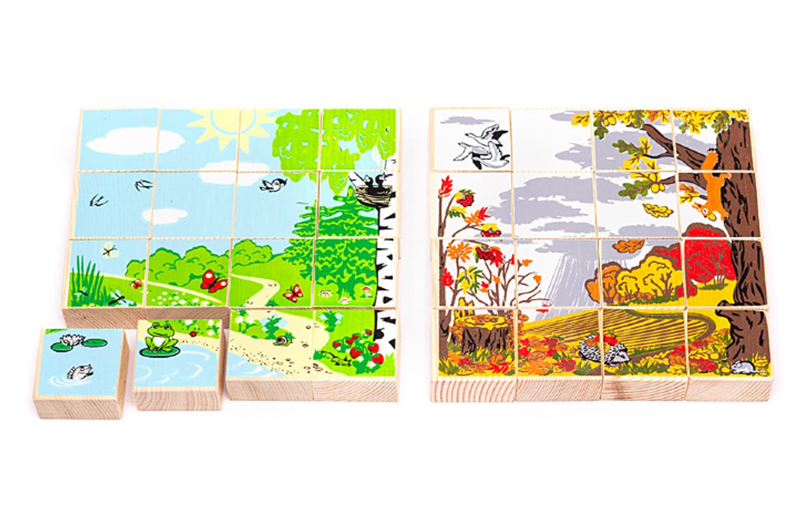 Обучающий комплект «Времена года. Время суток» предназначен для познавательных занятий в ДО с дошкольниками младших и средних групп. Материал представляет собой три комплекта кубиков с фрагментами картинок, которые складываются в изображения времен года и суток. Таким образом, занятие направленно на несколько направлений развития: составление изображения задействует мелкую моторику, логику, внимание, пространственное мышление, а работа с готовой картинкой расширяет кругозор, развивает фантазию и воображения.