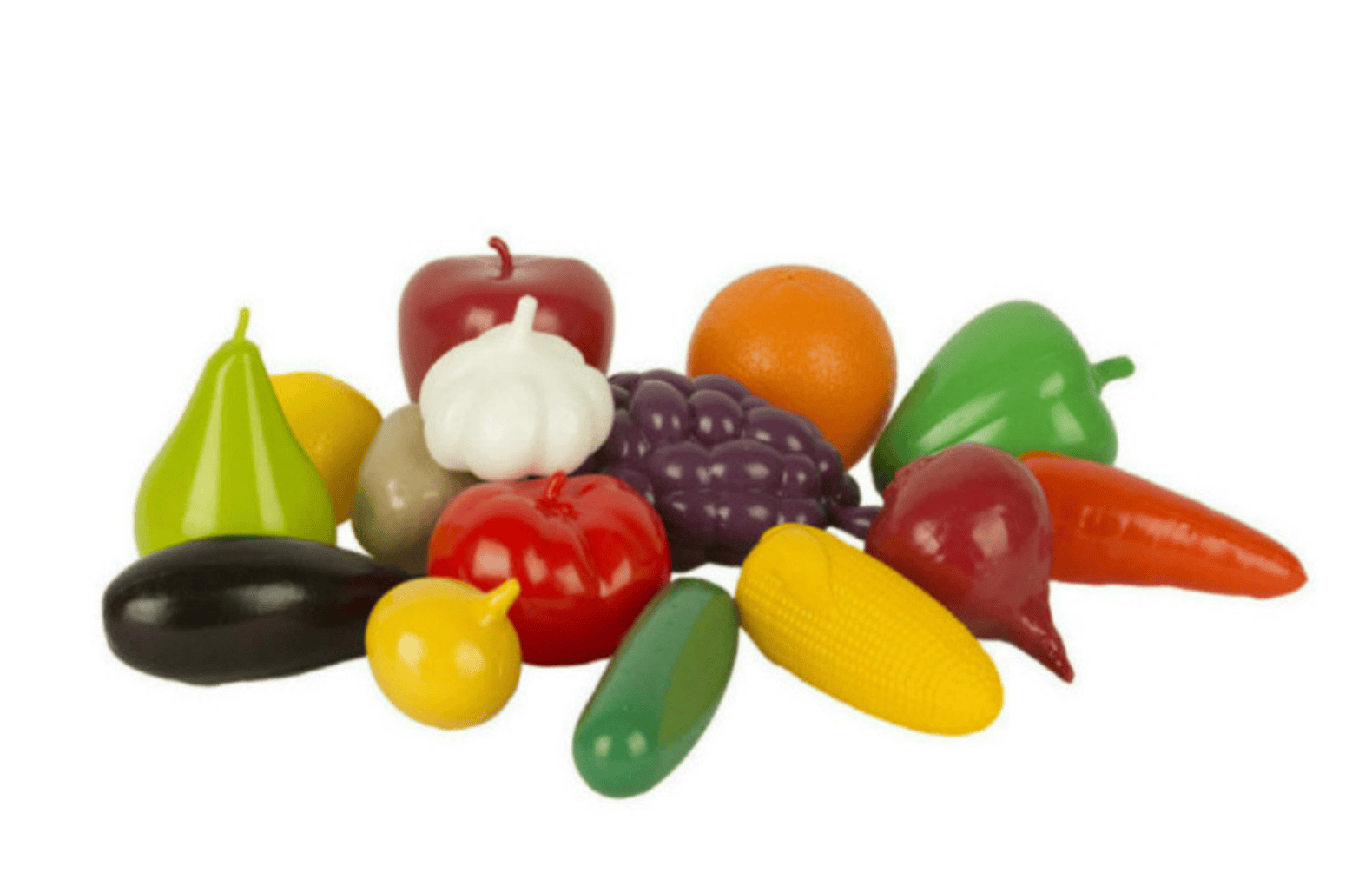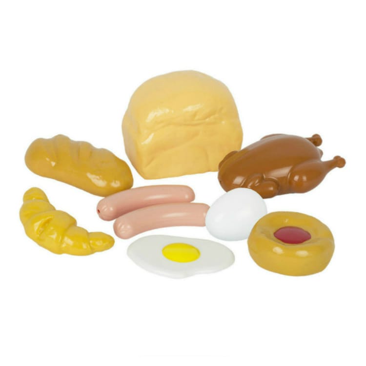 В комплекте "Продовольственный набор" 24 предмета: виноград, лимон, апельсин, банан, груша, яблоко, огурец, перец, морковь, свекла, кукуруза, картофель, баклажан, помидор, лук, чеснок, хлеб, батон, круассан, плюшка, яичница, курица, сосиски 2шт. Набор представлен в пластиковом контейнере №5, который выполнен из прозрачной безопасной пластмассы, легко моется и не требует особого ухода.