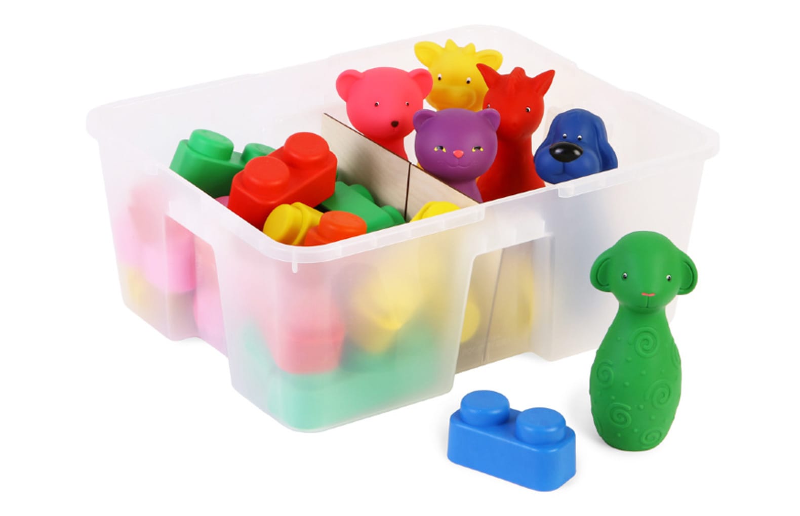 В составе:конструктор из мягкого материала, тактильные мини-кегли, мячик, контейнер Игротека №2.