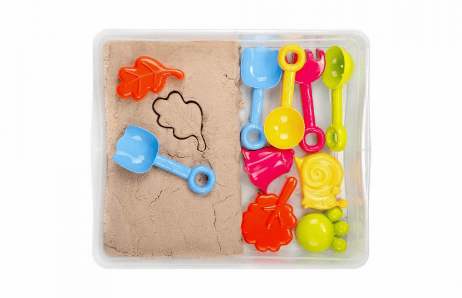 В комплектесенсорный комплект 2-х пластиковых настольных песочниц, в каждой: 3 кг кинетического песка, 2 лопатки, 1 ложка, 1 сито, 1 грабли, 6 формочек