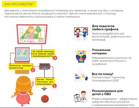 Комплекс подходит для занятий с детьми от 3 лет в детских садах, центрах развития и коррекции детей. Преимущество данных занятий в том, что детям не нужно сидеть за столом или писать что то на доске, они видят занятия на экране и управляют ими на расстоянии! Сам процесс доставляет детям много радости, но при этом они изучают множество полезных предметов, приобретают новые знания, умения и навыки.