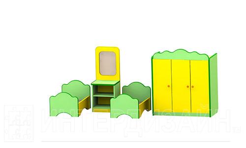 Комплект спальной мебели состоит из двух односпальных кроватей, одного шкафа и трюмо с зеркалом. Приятное сочетание зеленого и желтого будет радовать ребенка. Шкаф имеет 3 отдела для верхней одежды и личных вещей детей.