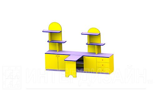 Уголок имеет тумбы с дверцами и полками. Это удобно тем, что в них можно поместить различные пособия. Справа три выдвижных ящика, в середине откидывающийся стол. К тумбам прикреплены два модуля с этажерками, на которые можно поставить книги, карандаши, игрушки. Благодаря хорошей вместимости уголок всегда будет выглядеть аккуратно.